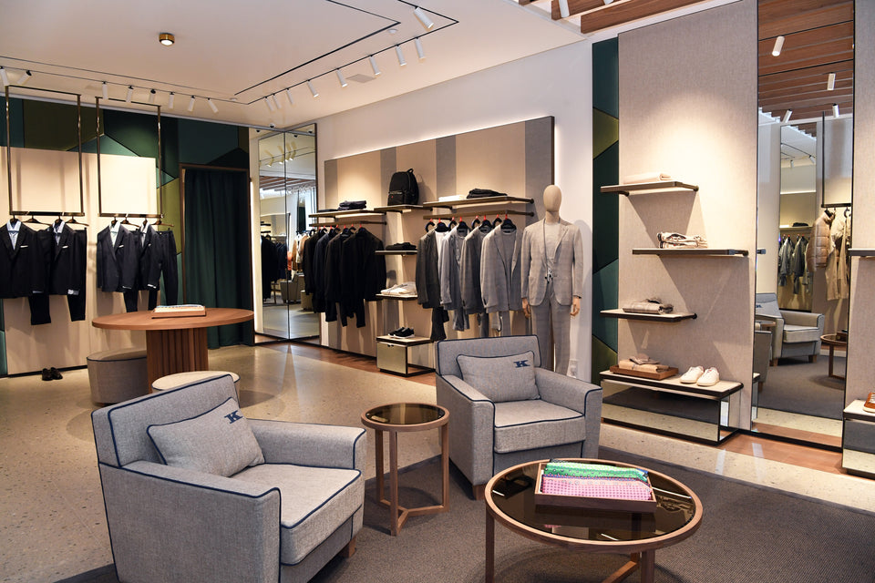 The interiors are designed to highlight the garments on display, featuring a neutral color palette, soft finishes, and textured fabrics, complemented by details in Canaletto walnut wood and nickel-toned metals. The entire décor, fully customized and made in Italy, reflects the craftsmanship and quality that have always set Kiton apart. It offers visitors an exclusive and immersive shopping experience where luxury and sustainability coexist in perfect harmony.