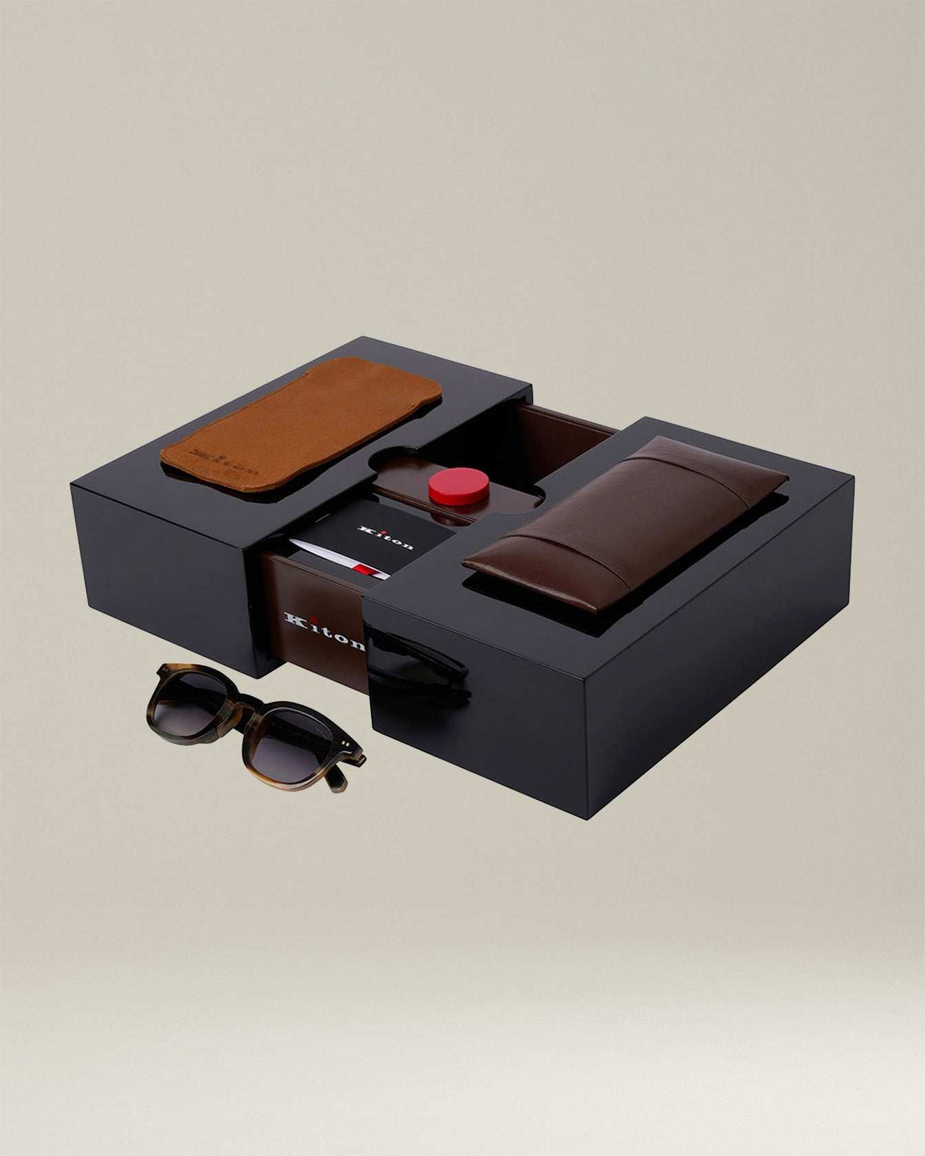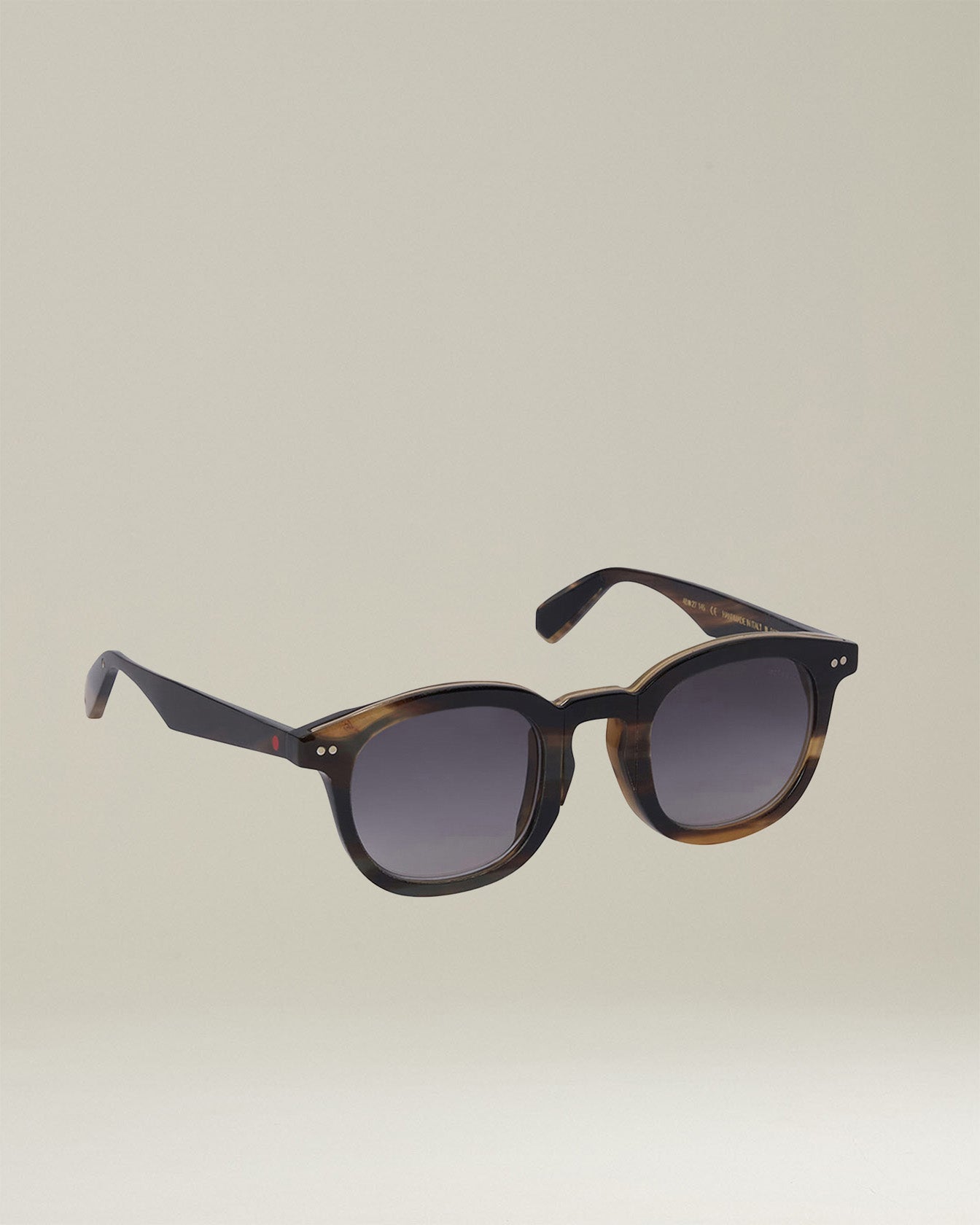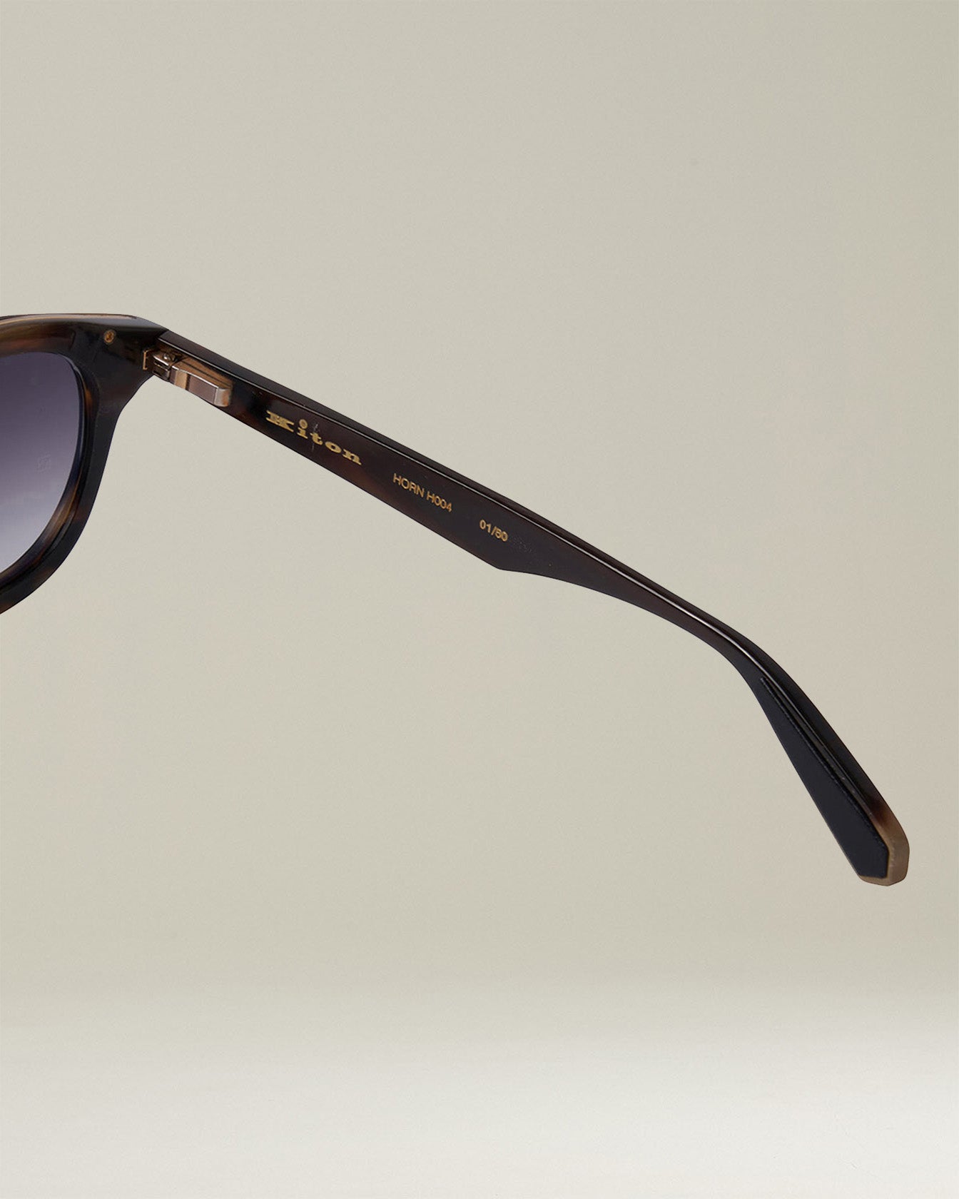 Limited edition numbered horn sunglasses in light brown with grey shaded lenses. Inspired by the iconic Panto design dedicated to the great architect Le Corbusier, and consecrated by Hollywood’s Golden Age as a protagonist of 20th century American culture, the frame has a thick round shape and has been reinterpreted in a modern way to give the glasses a strong personality and a casual attitude in keeping with the refined aesthetics and relaxed elegance of Kiton. The horn is Indian buffalo horn,a lightweight natural material, the color variations of which make each piece unique. In full compliance with environmental and animal welfare standards, the horns used to make the glasses come from buffaloes bred naturally for their meat who have died of natural causes. Innovation. Quality. Italian soul: Kiton horn sunglasses are handcrafted in Italy and use a revolutionary patented frame rotation system that protects the lenses from scratches and impact by overlapping the temples on both sides of the frame. The Zeiss 4-base nylon lenses feature an anti-reflective coating on the back as well as a scratch-resistant, oil-phobic and hydrophobic coating.