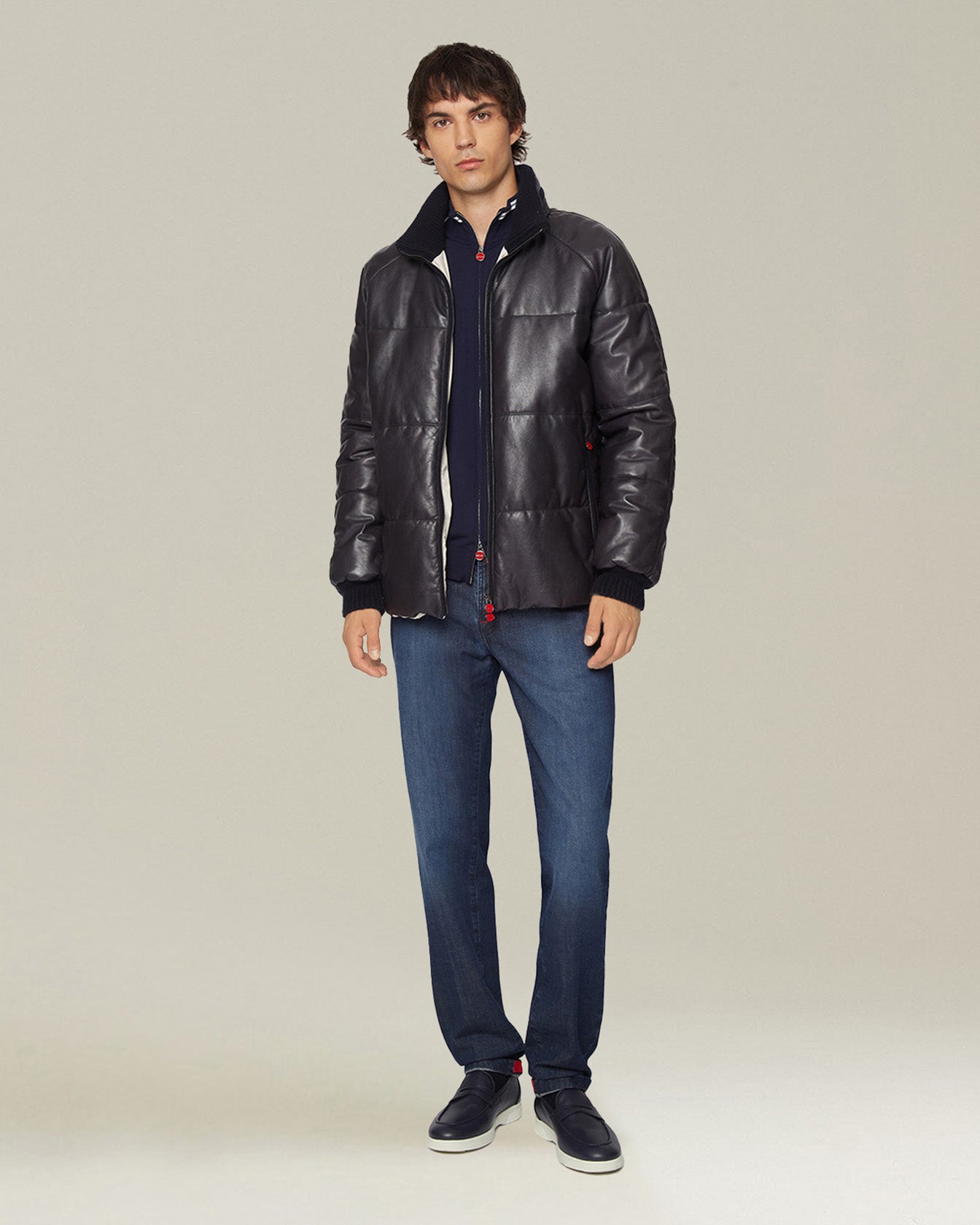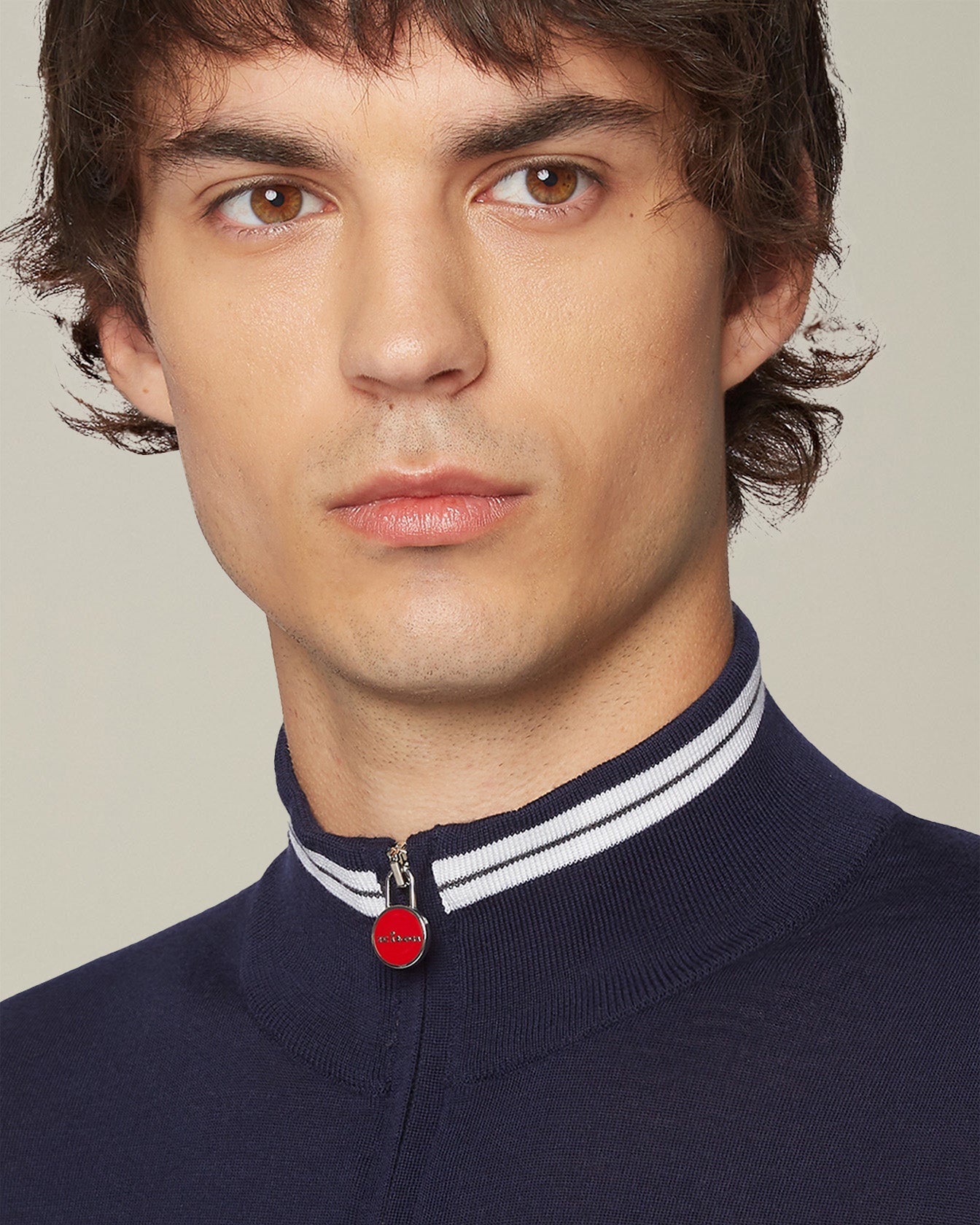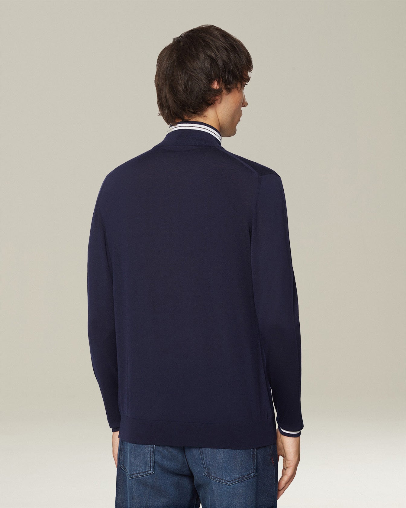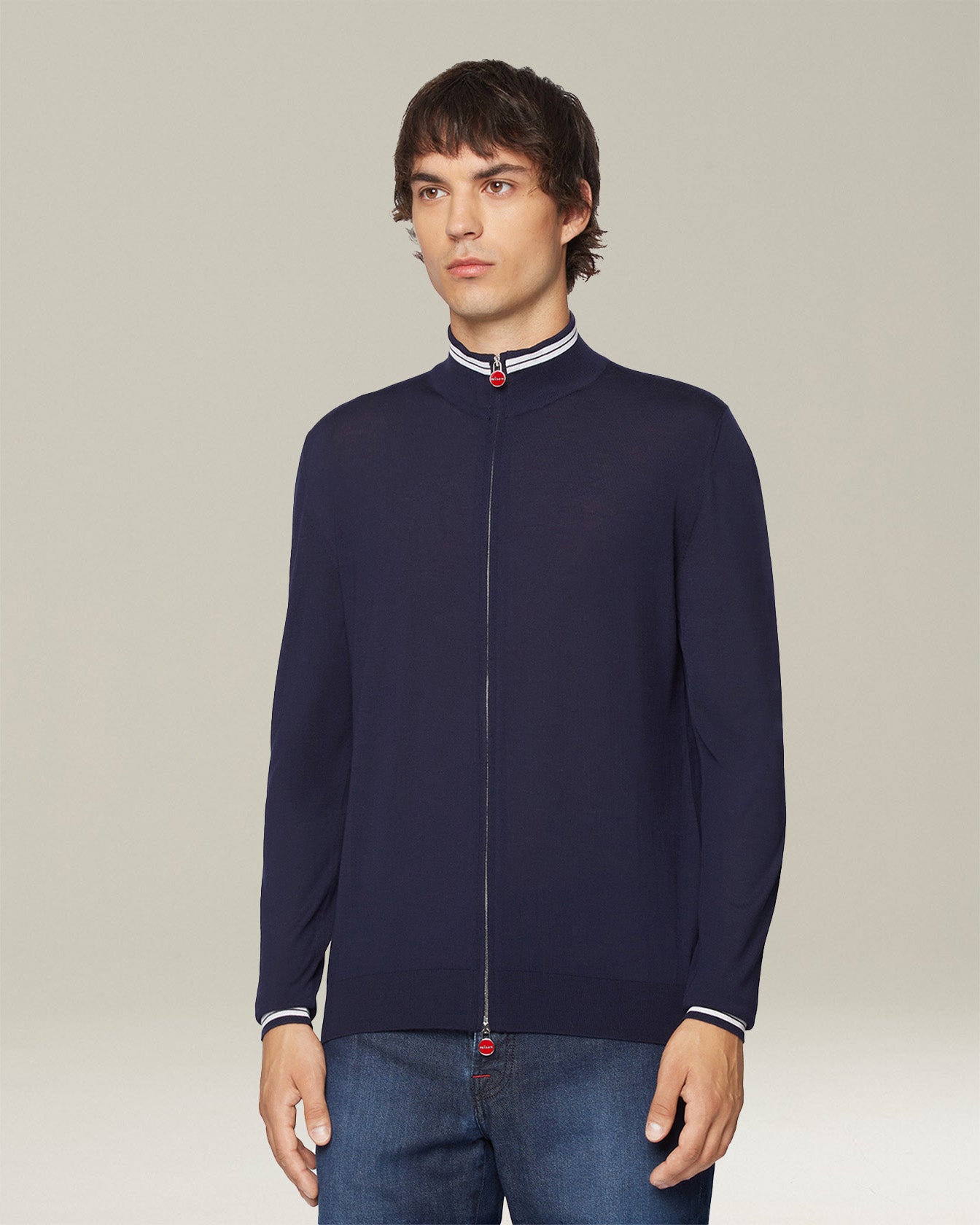 The versatile and essential aesthetic of the cardigan blends with the impalpable feel of our fine wool yarn. The light, enveloping texture accentuates the contrasting profile details that give it a sporty appeal. The fit is regular and comfortable, making this garment an essential element for a discreet yet distinctive style. Kiton knitwear embodies loyalty to tradition and the constant quest for excellence.