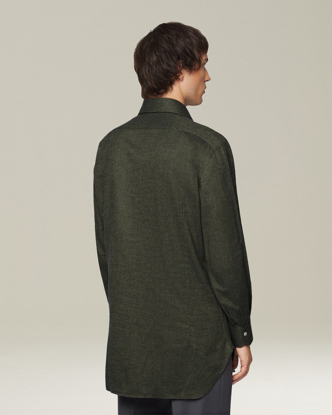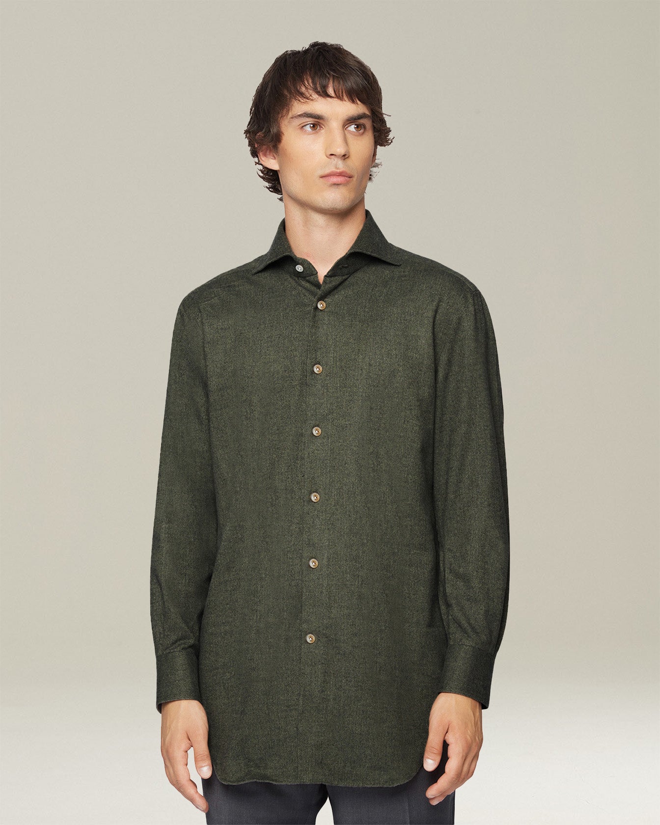 The fine cotton flannel offers an elegant and modern reinterpretation of a tailoring classic. Perfect for cold weather, this shirt combines warmth and comfort without sacrificing style, ideal either under a blazer or paired with smart trousers, adding a touch of sophisticated practicality to a man’s wardrobe. Thanks to 22 handcrafted steps in our Naples atelier, this shirt embodies the excellence of craftsmanship: each cut of fabric, precisely aligned to ensure a uniform pattern, conceals finely hand-sewn seams that are extremely soft and ensure exceptional comfort, harmoniously following the body’s movements and enhancing the silhouette. The sophistication of the garment is further enhanced by the hand-carved buttons made from prized Sydney Pinctada Maxima mother of pearl, caught off the coast of Australia.