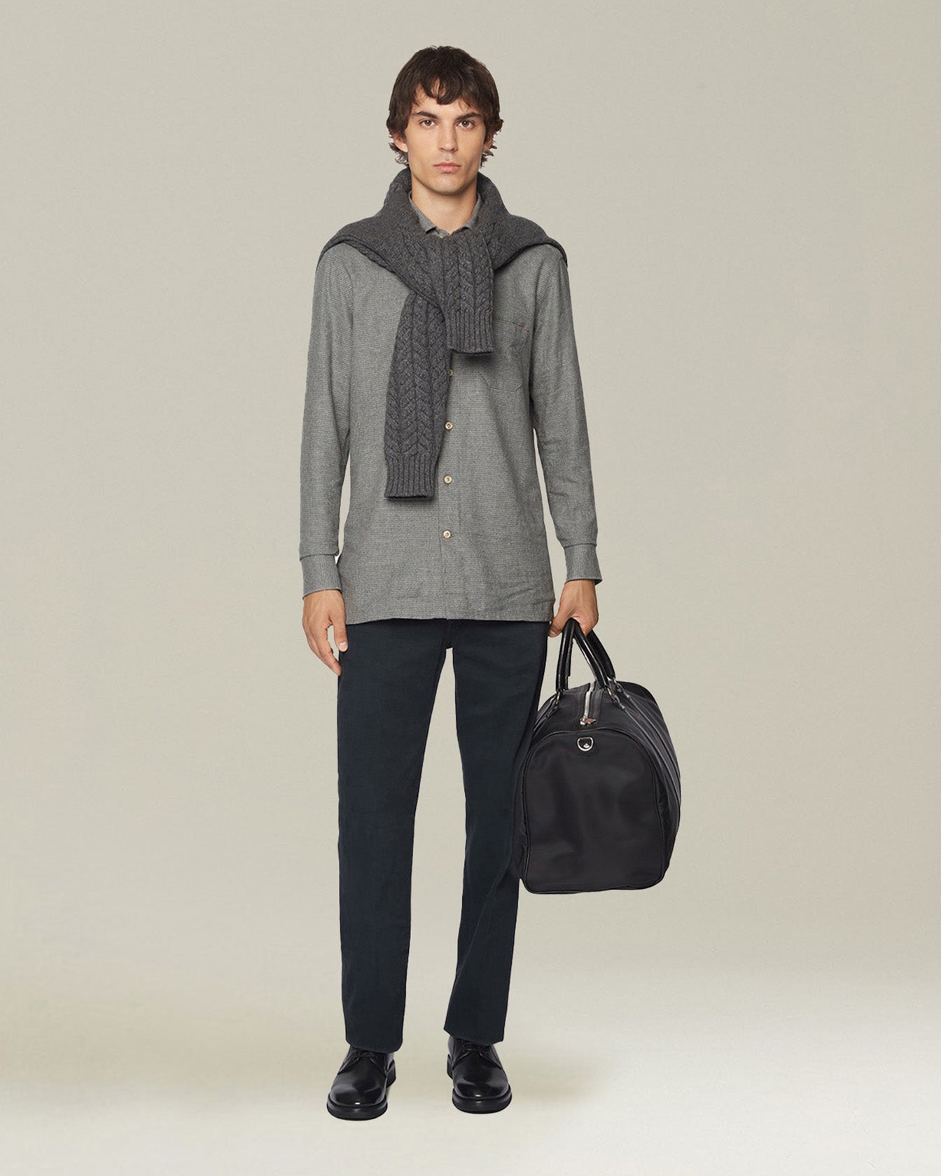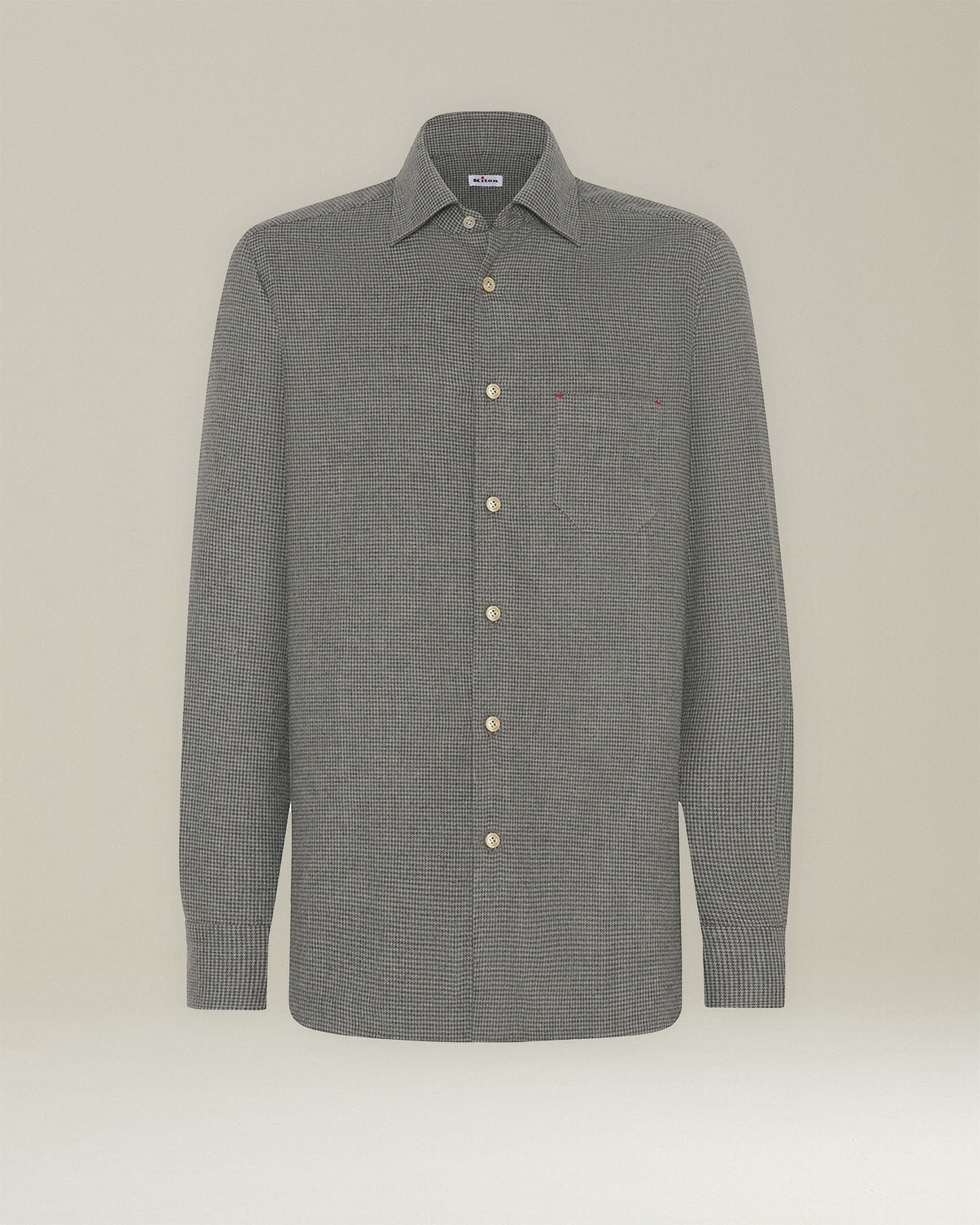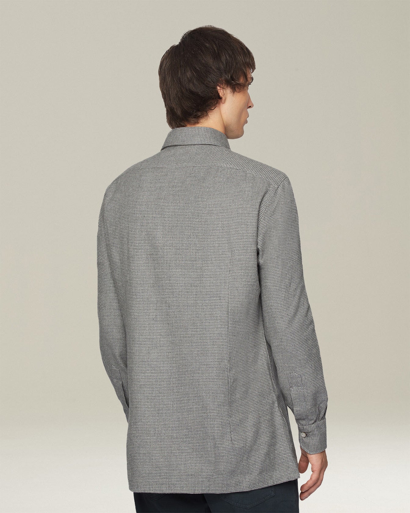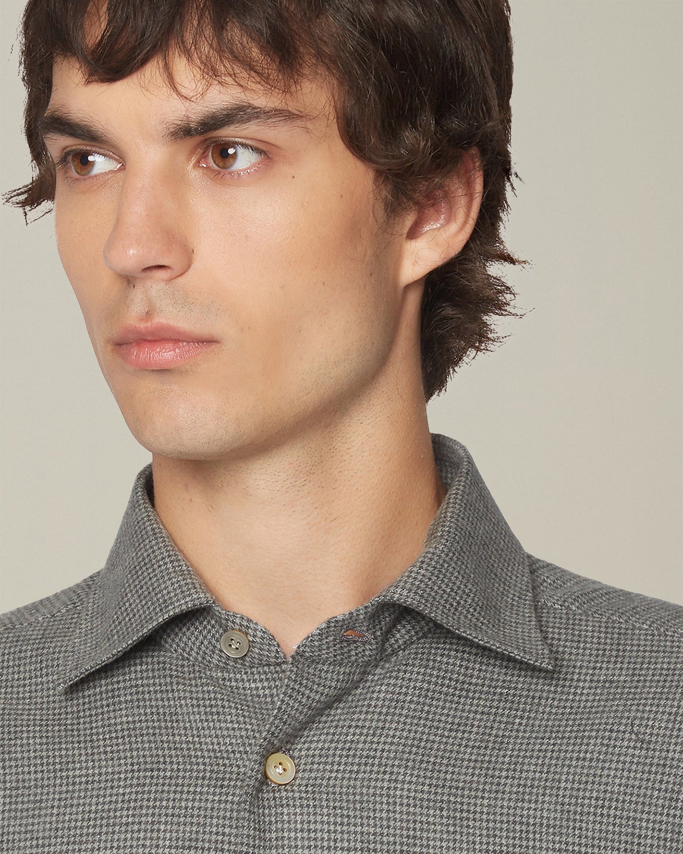 The classic elegance of the houndstooth pattern is embodied in the iconic Nerano shirt, presented in exclusive cotton flannel, a delicate, fine fabric that modernises a clothing classic. Ideal for cold weather, this shirt features a breast pocket with two red bar tacks and a straight lower hemline. The back is embellished by two side darts that offer greater comfort and freedom of movement without compromising on elegance. Precisely handcrafted in our Naples atelier in 22 steps, this shirt represents the pinnacle of artisanal savoir faire: each cut of fabric, precisely aligned for a uniform design, conceals finely hand-stitched, extremely soft seams that ensure exceptional comfort, harmoniously following the body’s movements and enhancing the silhouette. The sophistication of the garment is further accentuated by the hand-carved buttons made from Sydney Pinctada Maxima mother of pearl, cultivated off the coast of Australia.