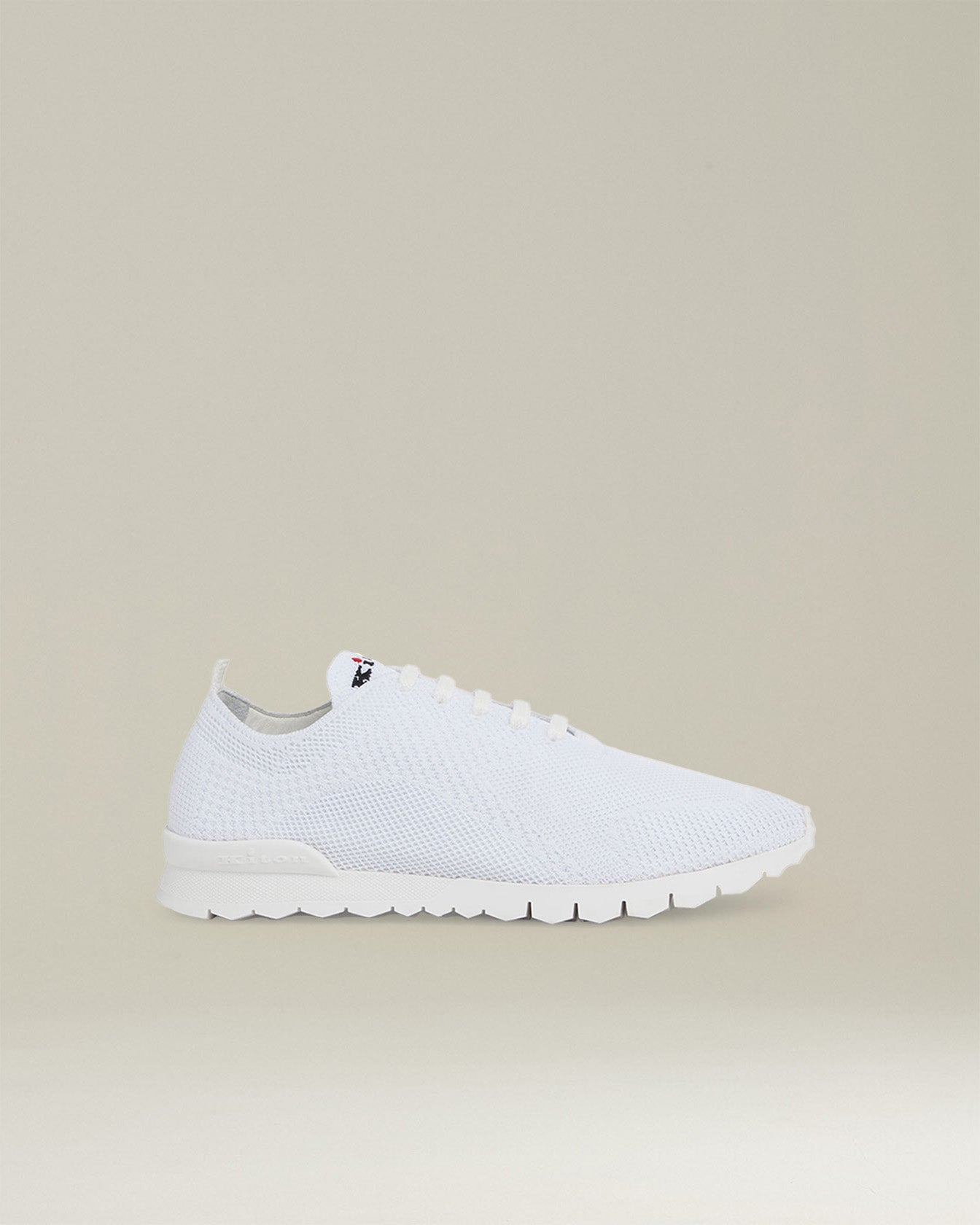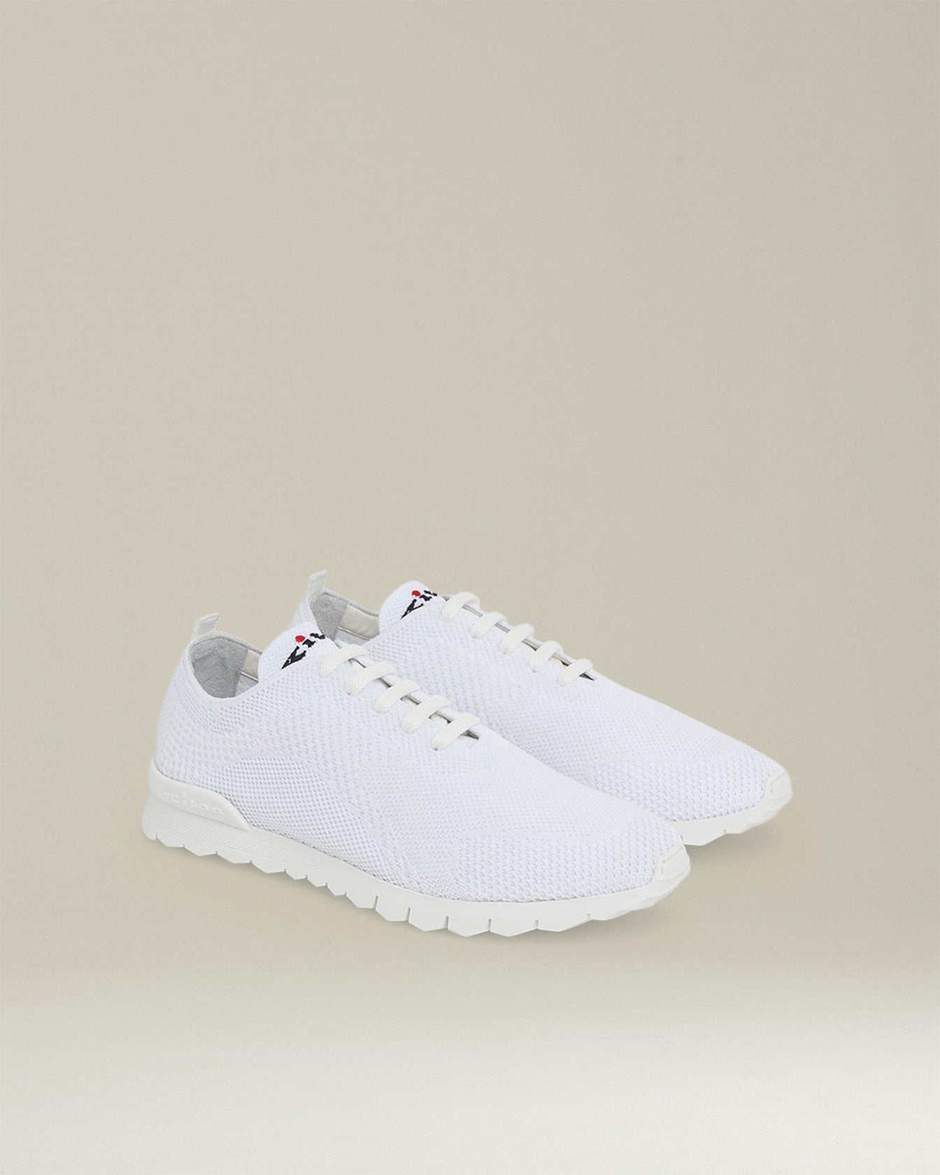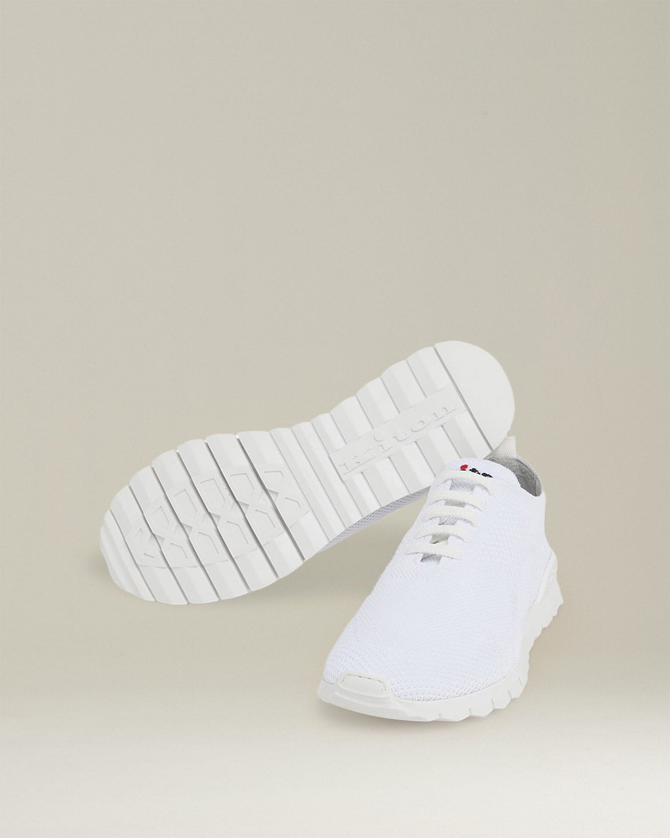 White knit sneakers. The one-piece upper of these trainers is in Kiton knit fabric, rendered unique by the graphic juxtaposition of different stitches. The white sole is flexible and extra-light under foot, and is combined with an elasticated tonguefor added comfort. Embroidered Kiton logo; stretch mesh laces which feature the iconic red aglet. All Kiton products are made by expert artisans in our atelier in Naples. The Kiton mission is to innovate in terms of aesthetics and technique, while always keeping tradition in mind. For this item, we’ve interpreted sneakers according to the philosophy of the fashion house, placing quality first and foremost. The benefit of hand-made products lies in their superior comfort: in this case, a particularly soft and ergonomic insole. Dry clean to keep them looking their best.