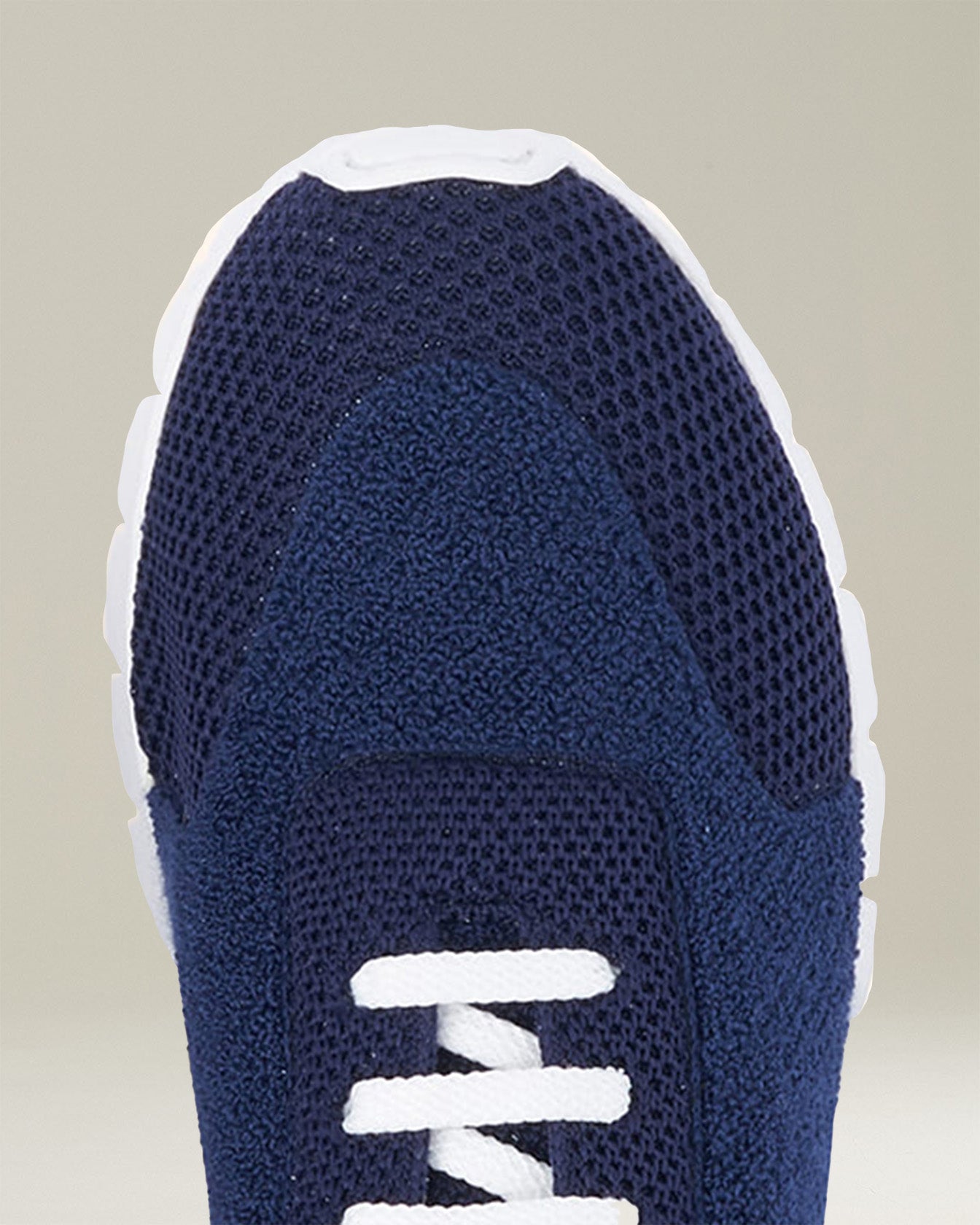 Navy blue knit sneakers. The one-piece upper of these trainers is in Kiton knit fabric with bouclé effect details, which makes them even more comfortable and warm. The white sole is flexible and extra-light under foot, and is combined with an elasticated tongue for added comfort. Embroidered Kiton logo; stretch mesh laces which feature the iconic red aglet. All Kiton products are made by expert artisans in our atelier in Naples. The Kiton mission is to innovate in terms of aesthetics and technique, while always keeping tradition in mind. For this item, we’ve interpreted sneakers according to the philosophy of the fashion house, placing quality first and foremost. The benefit of hand-made products lies in their superior comfort: in this case, a particularly soft and ergonomic insole. Dry clean to keep them looking their best.