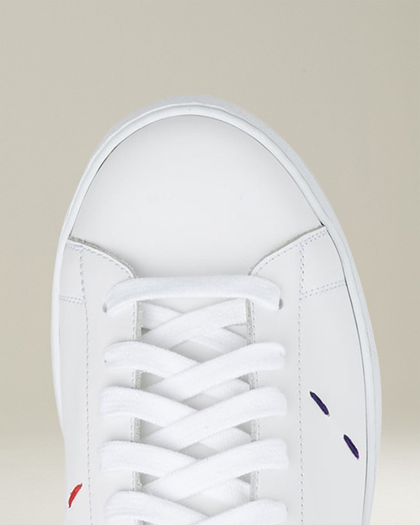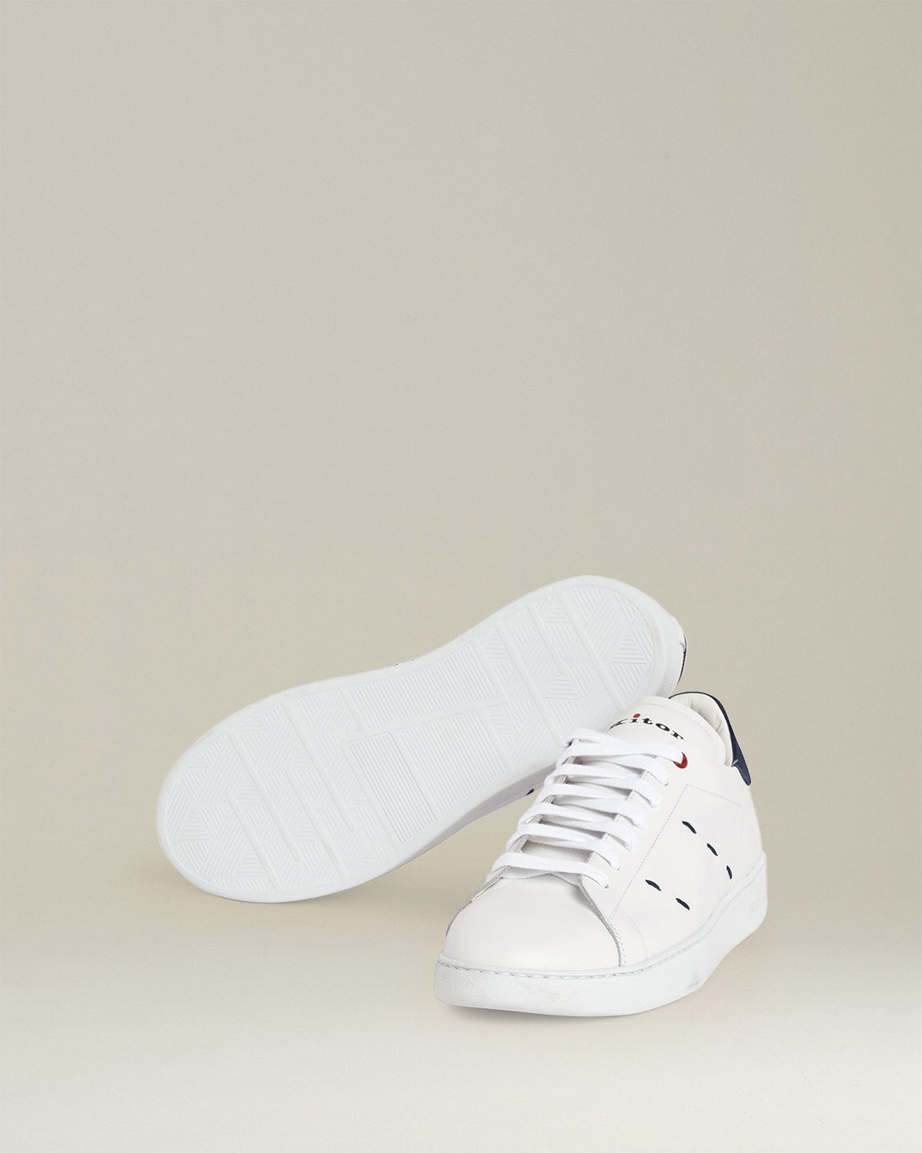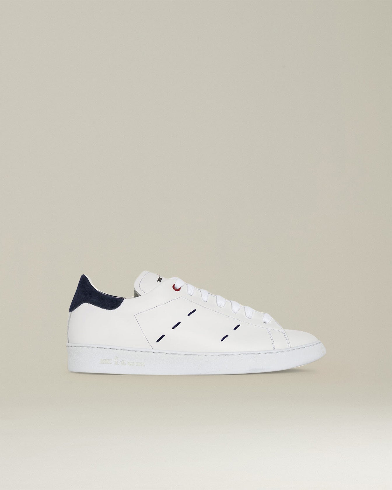 White calfskin sneakers with a cup sole, embellished by blue and red maxi stitching at the sides and a blue suede heel tab. The sole in EVA, an innovative, flexible, hypoallergenic, non-toxic and shock-absorbing material, makes these sneakers exceptionally flexible, comfortable, and well-suited to year-round use. White calfskin lining. All Kiton items are made from carefully-selected leather that has been assembled by expert craftsmen in our atelier in Naples. The high-quality hides have been worked manually, using artisanal washes and dying methods. Every irregularity, colour clouding, veining or creases distinguishes Kiton products, making them unique. The Kiton mission is to innovate in terms of aesthetics and technique, while always keeping tradition in mind. For this item, we’ve interpreted sneakers according to the philosophy of the fashion house, placing quality first and foremost. The benefit of hand-made products lies in their added comfort. Dry clean to keep them looking their best. To maintain the beauty and characteristics of our products, we recommend following a few simple rules: avoid exposing the item to light, heat and humidity for extended periods of time; avoid contact with fats and oils, products for make-up, perfume and solvents; keep out of contact with water when possible.