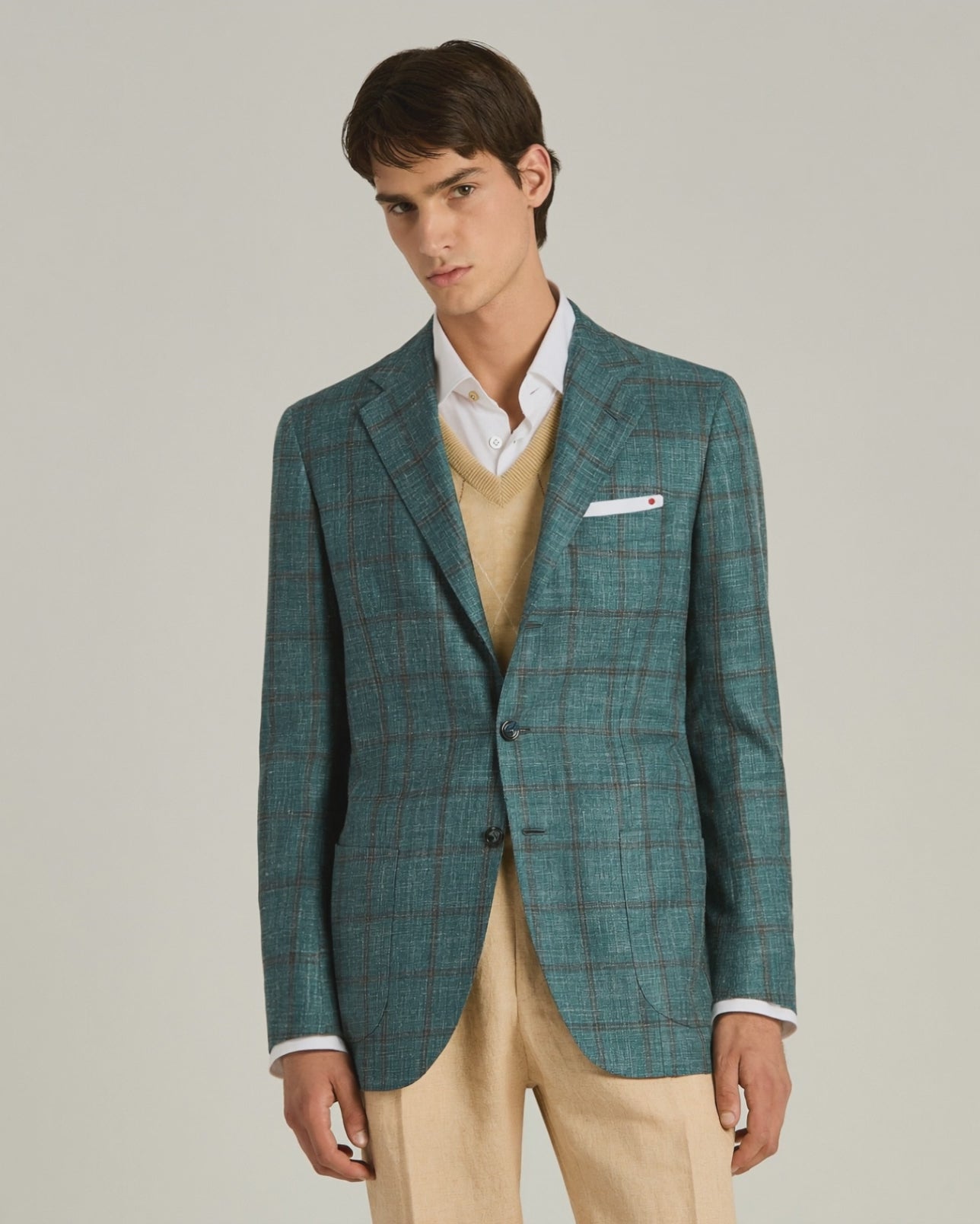 Crafted from a sophisticated cashmere, silk and linen blend, this single-breasted Kiton jacket interprets the checked pattern with an elegant, contemporary balance. The fabric, developed at our Biella wool mill, combines the natural softness of cashmere with the luminosity of silk and the freshness of linen, resulting in a crisp, pleasantly lightweight handle.The unstructured construction, the result of over 1,800 steps performed by hand by around 25 master tailors at our Naples atelier, enhances a fluid, natural fit designed to follow movement without restriction. The discreet yet refined checked pattern adds depth to the garment and enhances its versatility, making it ideal for both sartorial pairings and informal interpretations with strong character. A jacket that expresses the essence of Kiton style: balance, lightness and sophisticated ease.