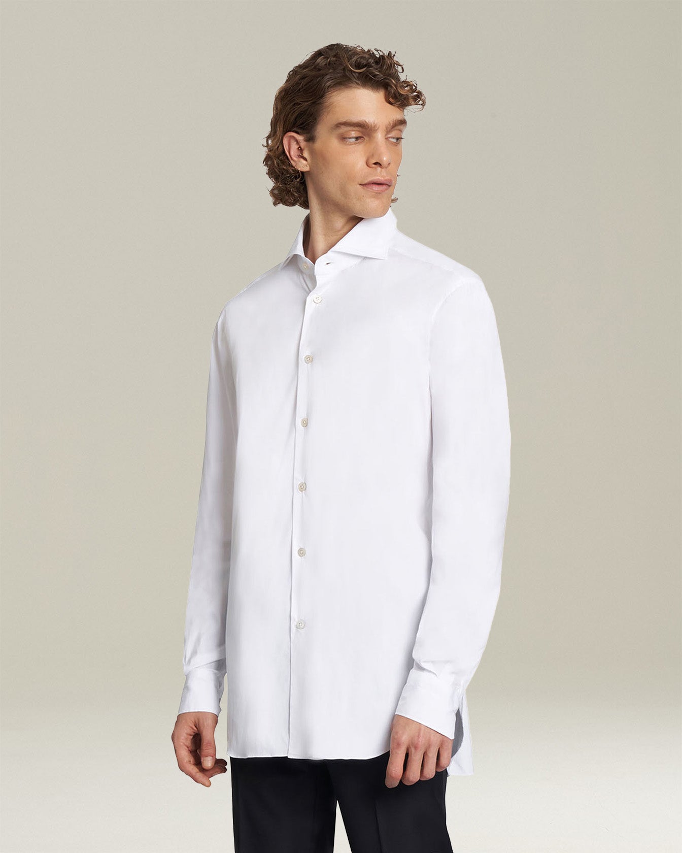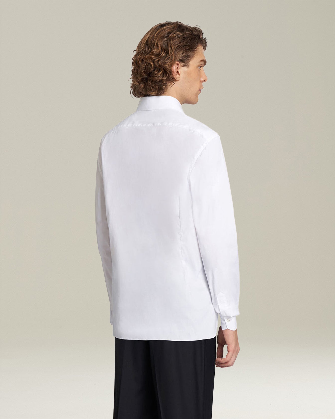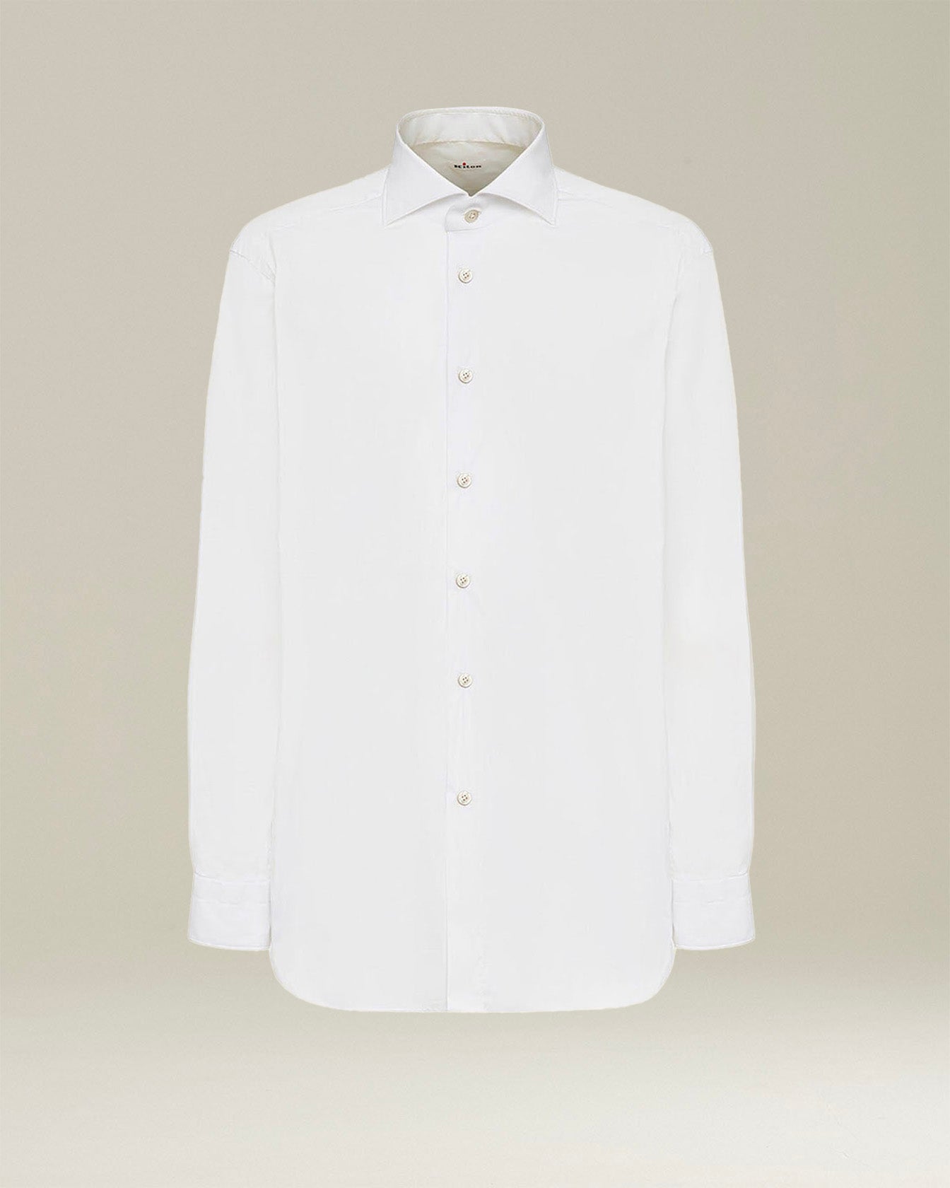 White shirt in a cotton blend. Every cut of the fabric, aligned to make the design uniform in each and every point, conceals extremely soft hand-sewn seams. The hand-carved buttons are made of Sydney Pinctada Maxima mother-of-pearl, cultivated off the coast of Australia. 22 steps completed by hand in our atelier in Naples: every millimeter, every single atom of a Kiton shirt is infused with experience. Savoir-fair is alive in the art of tailoring. This Kiton shirt is perfect worn with a suit for formal and professional occasions, and for free time as a key part of casual looks: it will complete any outfit with sophisticated, original style. To maintain the beauty of your Kiton shirt, we recommend professional laundering and pressing.