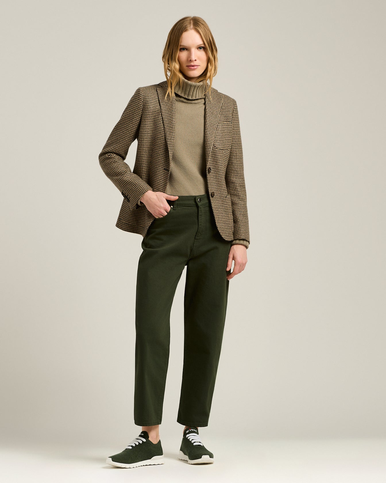 A synthesis of structure and refinement, this women's single-breasted jacket is crafted from pure cashmere with refined houndstooth pattern. The clean, feminine cut enhances the silhouette, while the sartorial construction showcases all of Kiton's manufacturing expertise. Featuring classic lapels, two-button horn closure, pockets and welt breast pocket, this jacket represents the ideal balance between style and everyday comfort. A timeless piece, designed to elegantly accompany every moment of the day.