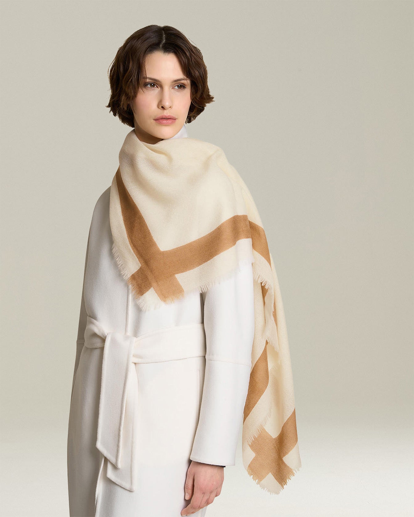 An indispensable luxury accessory for the cold season, this Kiton scarf combines elegance and functionality. Made from an exclusive blend of cashmere and silk, it features an eye-catching geometric print. The fine fibres guarantee extraordinary softness, offering enveloping warmth and unparalleled comfort. This distinctive garment adds a touch of class and sophistication to any outfit.