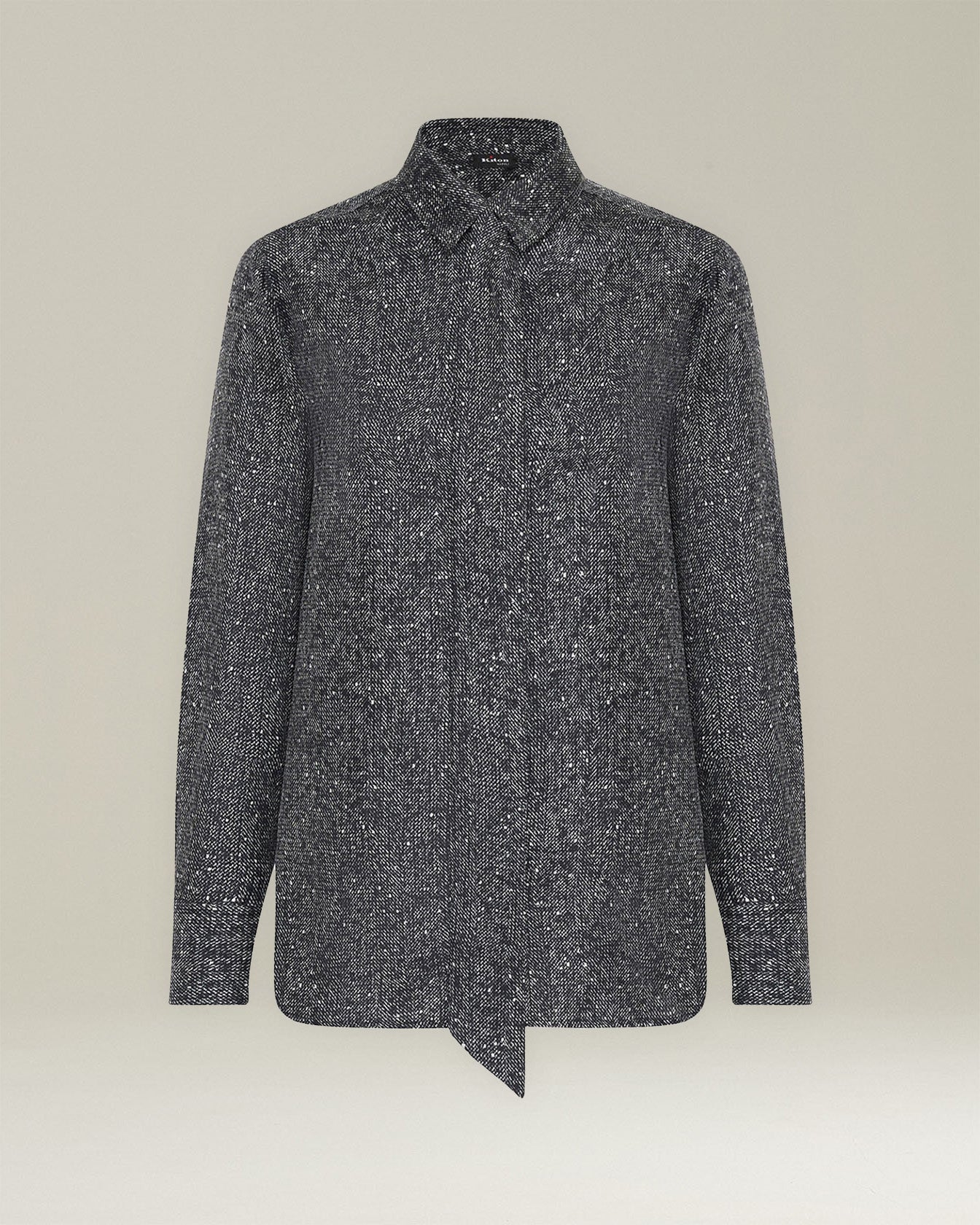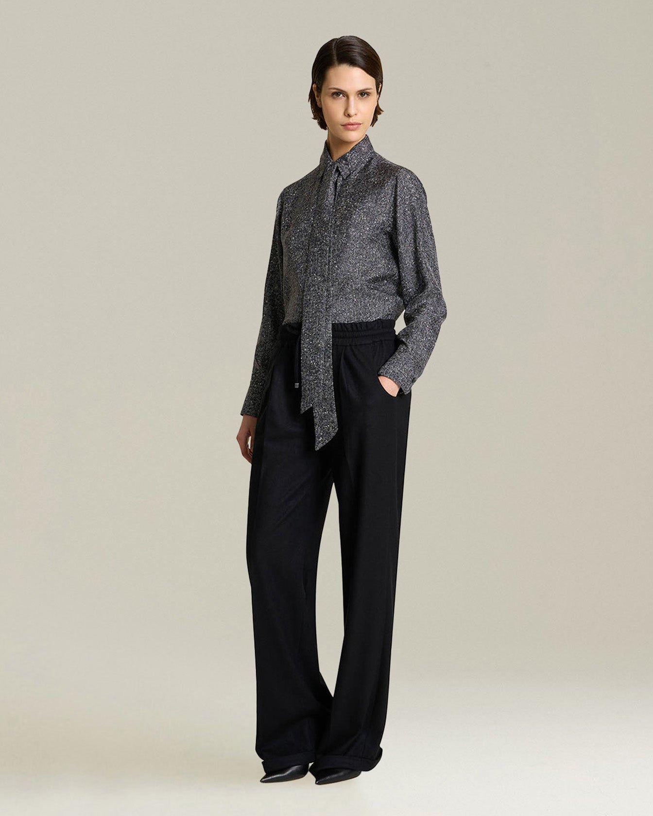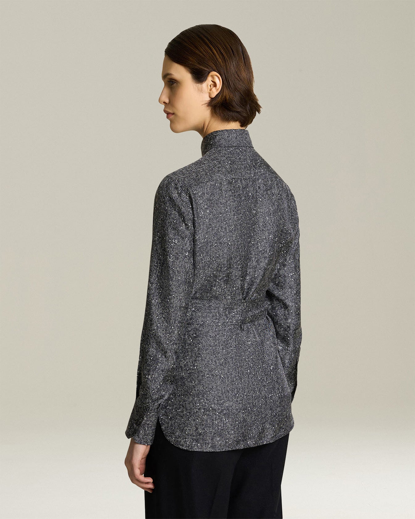 Masculine inspiration meets feminine lines in this classically cut silk shirt with a lamé effect. The sophisticated elegance of the garment is enhanced by the concealed buttoning, making it ideal for formal events. The design is complemented by a decorative scarf that can also be worn as a belt for a versatile touch. With 22 steps completed by hand in our Neapolitan atelier, each Kiton shirt reflects unparalleled craftsmanship.