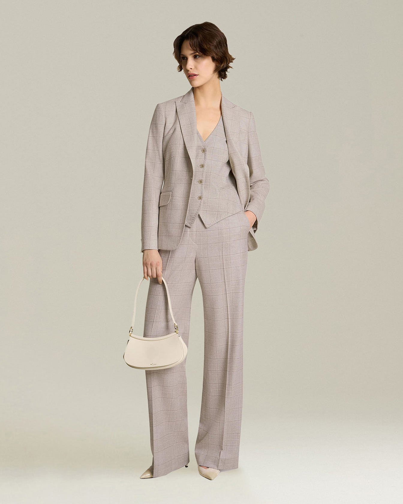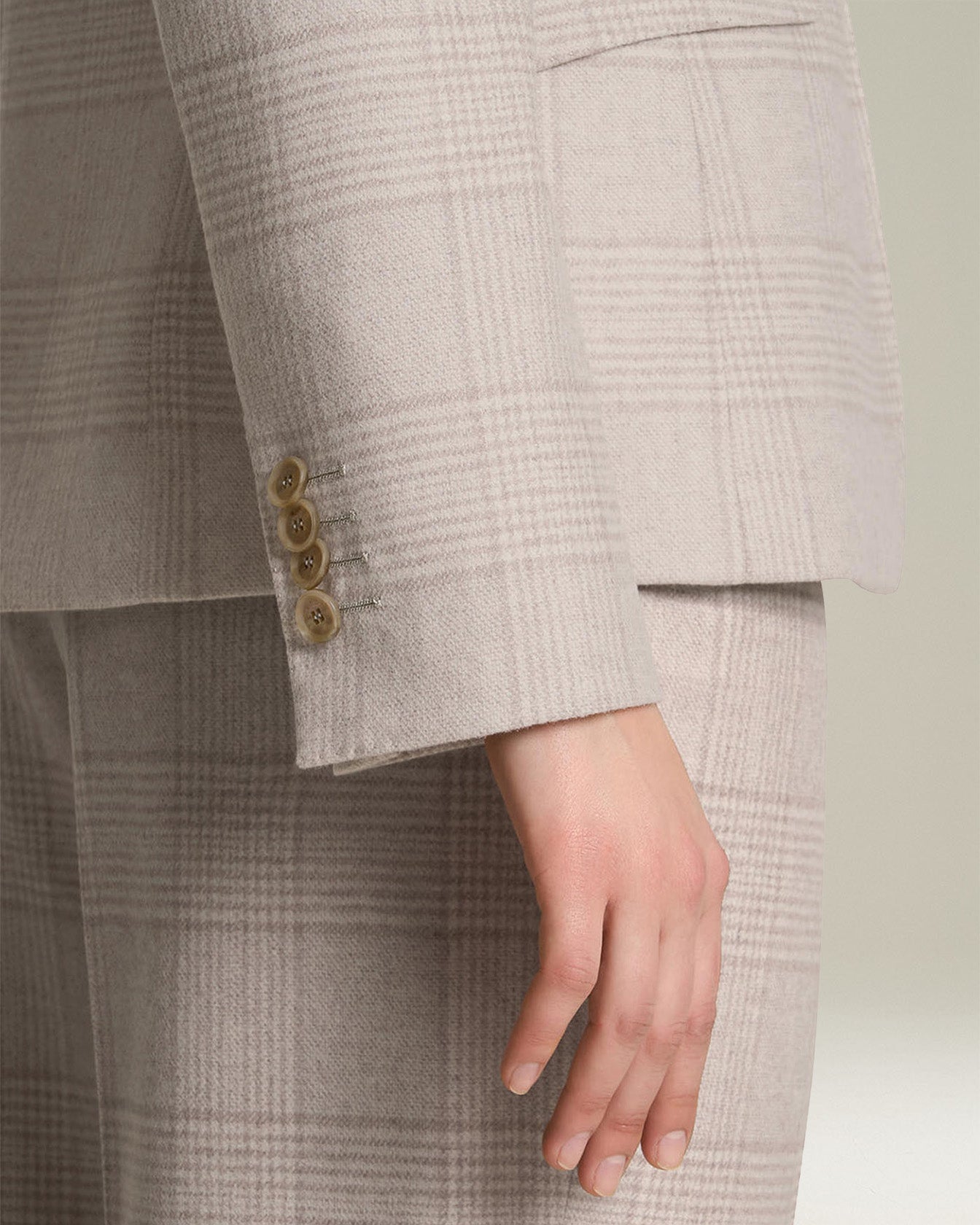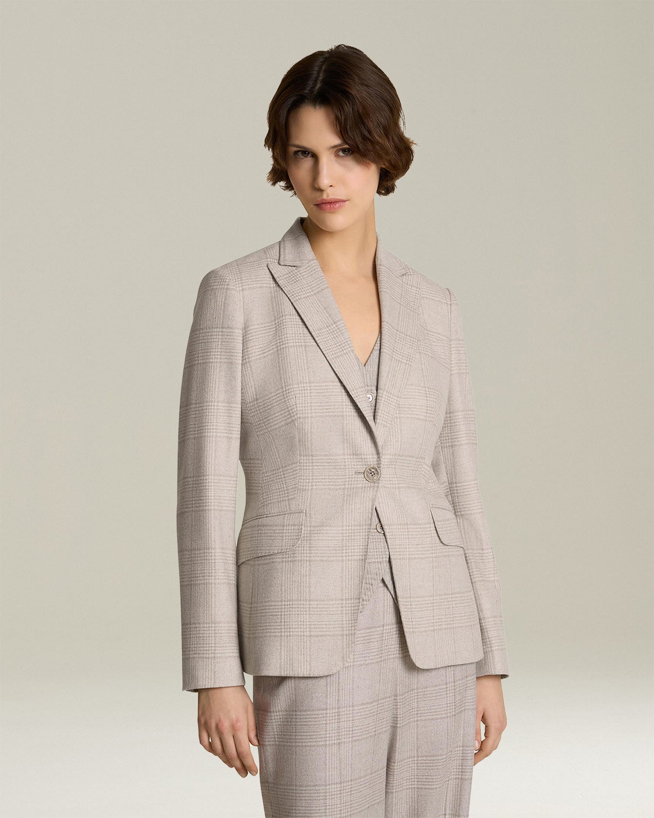 The jacket for stylish women with a strong, passionate personality, attentive connoisseurs of sartorial traditions. This single-breasted blazer, an iconic model and representative of Kiton’s sartorial savoir-faire, presents a clean and essential design that skilfully juggles the fine wool and cashmere blend, complemented by the traditional Glen plaid pattern. The impeccable design features peaked lapels, a single horn button and two welt pockets with flaps. Finally, the ‘barchetta’ breast pocket is a sartorial exercise in combining technique, aesthetics and functionality. Each Kiton jacket offers an experience of intimate and sophisticated luxury, the result of the skill of master tailors who create true sartorial masterpieces.
