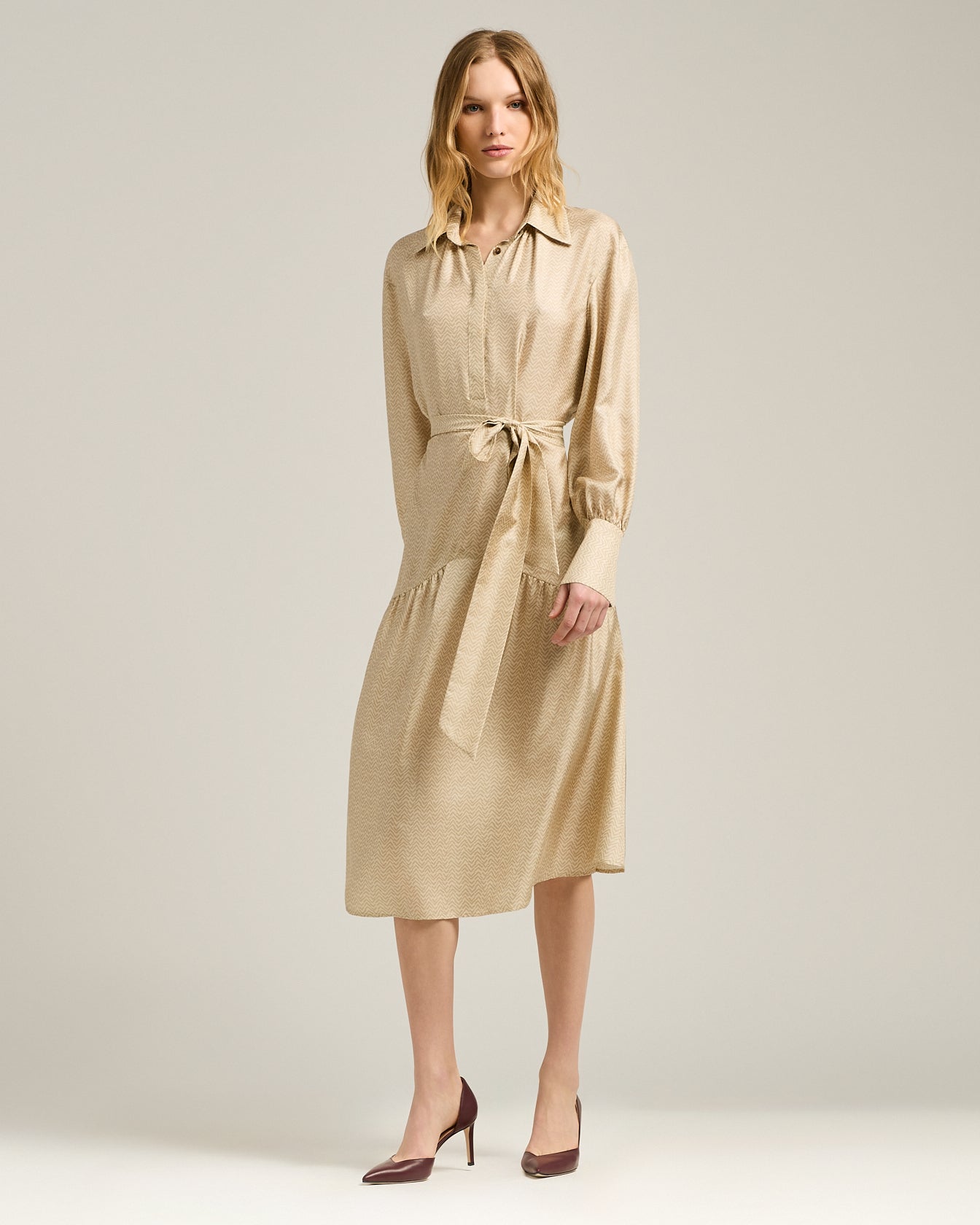 Delicate lines and sartorial construction define this shirt dress in pure silk, enhanced by a tone-on-tone geometric print. The fit is soft, with the waist regulated by a belt in matching fabric and a full skirt with asymmetrical cut that enhances movement. The classic collar and statement cuffs evoke the elegance of measured, timeless femininity. A piece designed to accompany daily gestures with understated refinement.