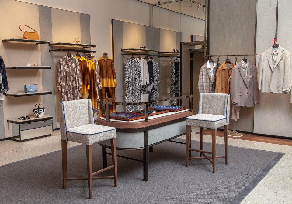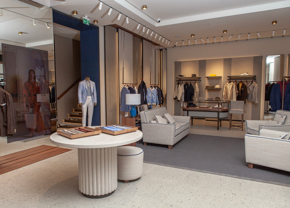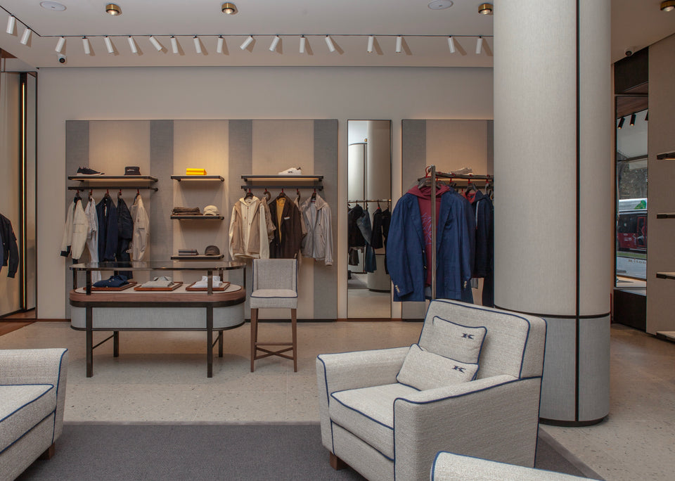 Il design della boutique riflette l'estetica raffinata e senza tempo di Kiton: un ambiente luminoso, con ampi spazi e un'atmosfera sofisticata che valorizza la qualità dei capi della maison. Materiali di altissimo pregio, come il marmo italiano, si combinano con un'illuminazione studiata per esaltare la bellezza delle collezioni, offrendo ai clienti un'esperienza di shopping unica e immersiva.
