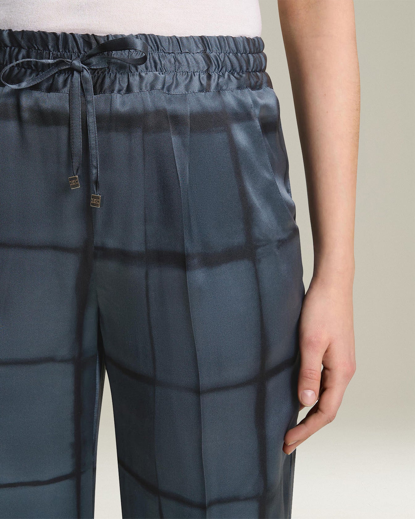Autentico must-have della collezione femminile Kiton, il panta coulisse coniuga comodità e stile, promuovendo la cultura dell'eleganza rilassata. Perfetto per affrontare un viaggio con classe, questo pantalone rivela un gusto ricercato e rappresenta la sintesi tra raffinatezza e praticità. La morbidezza della seta, impreziosita dalla stampa geometrica, dona alla vestibilità grande fluidità. Il capo è definito da un design con vita alta, elastico in vita, gamba ampia per una silhouette oversize che dona un easy feeling al look. Questo pantalone Kiton è adatto per ogni occasione, può esser indossato sia con un look sportivo che abbinato a uno stile casual chic con una giacca.