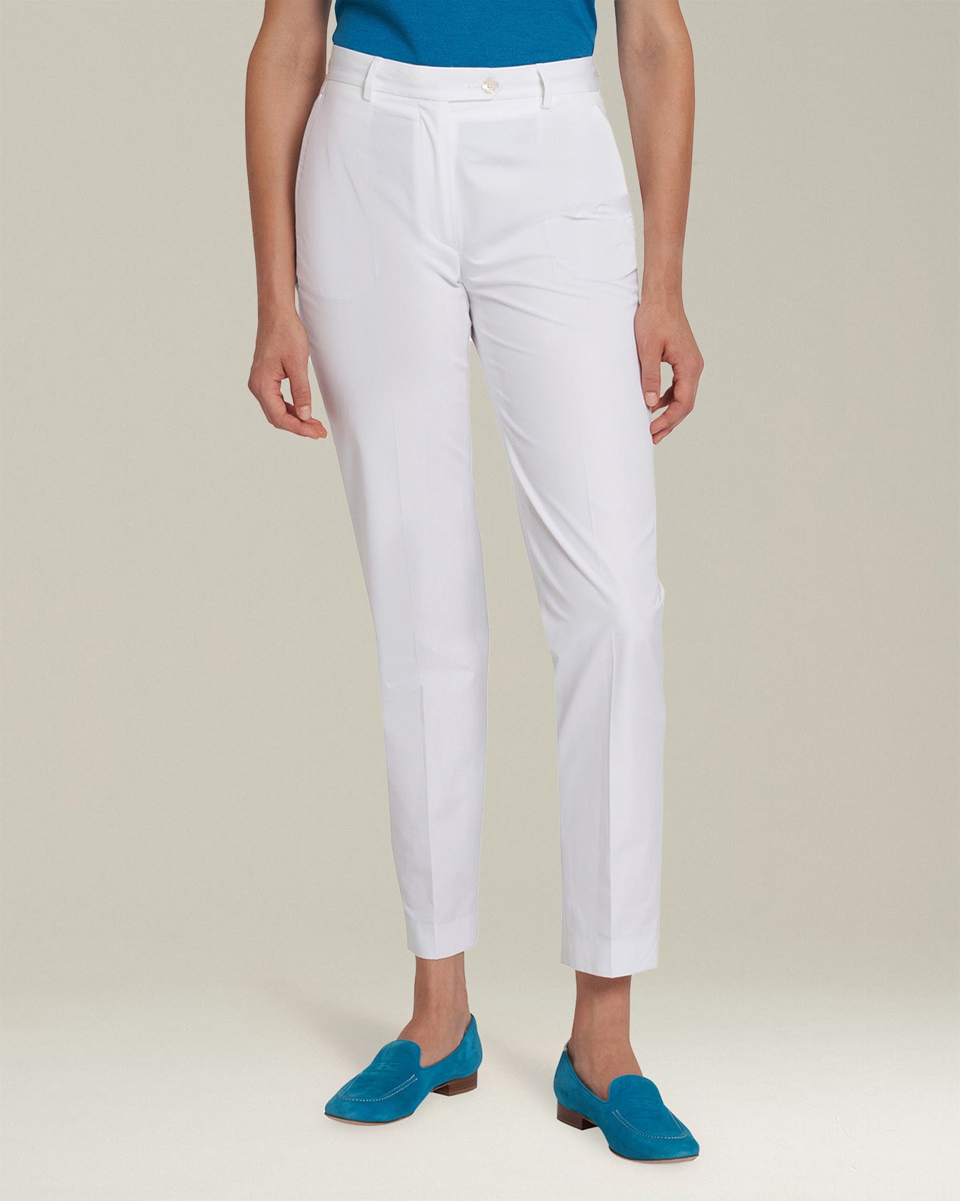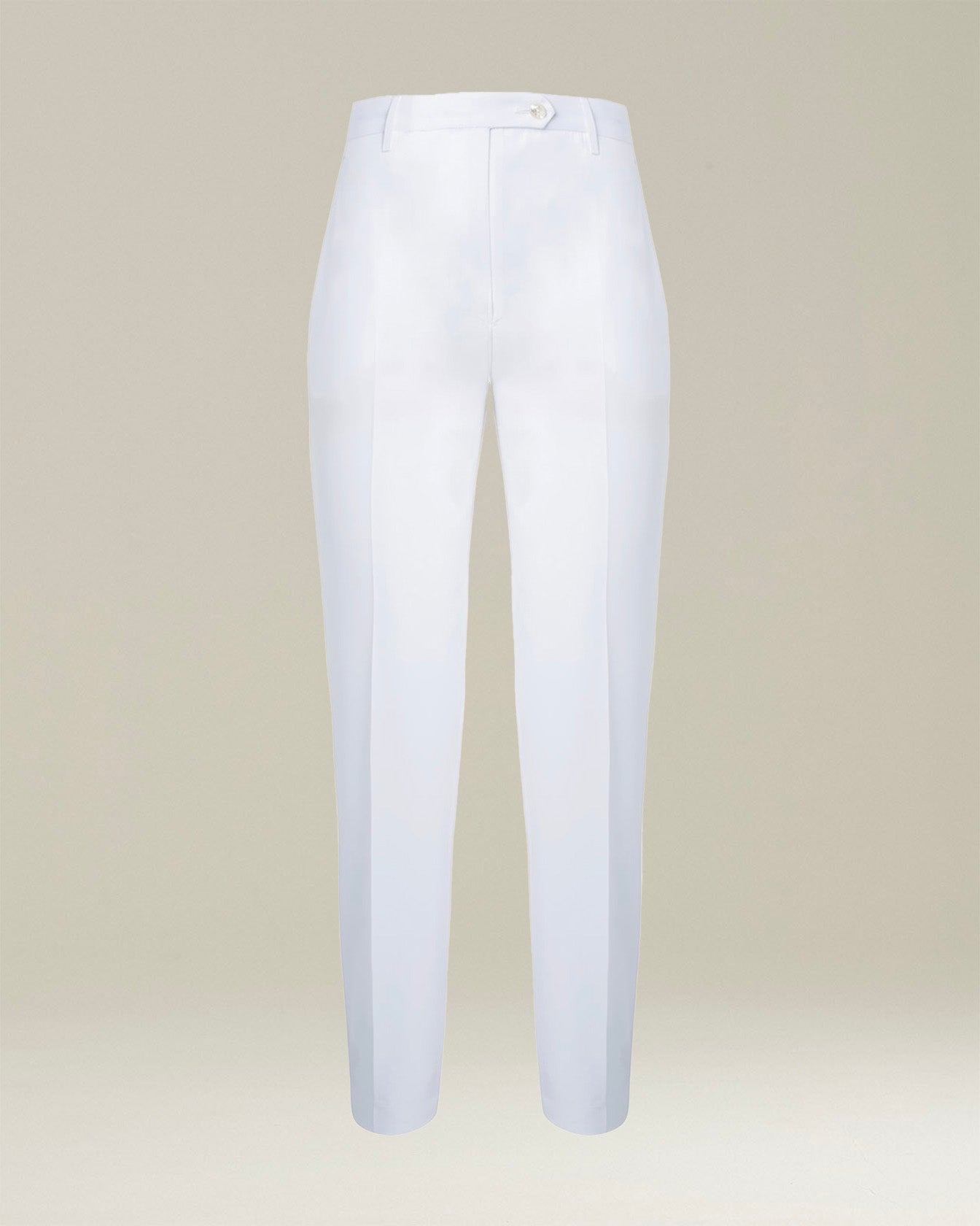 Pantalone a sigaretta realizzato in cotone di colore bianco. Il capo, interamente tagliato e cucito a mano a Napoli dai nostri maestri artigiani, presenta una costruzione sartoriale del capo che riflette un taglio tipicamente maschile con cintura interna e passanti esterni. Il pantalone presenta due tasche America e due tasche sul retro con bottoni. Questo pantalone Kiton è adatto per ogni occasione: può essere indossato sia con un look sportivo, che abbinato ad uno stile casual-chic con una giacca. Al fine di preservare la bellezza del tuo capo Kiton, suggeriamo lavaggio e stiratura professionale.