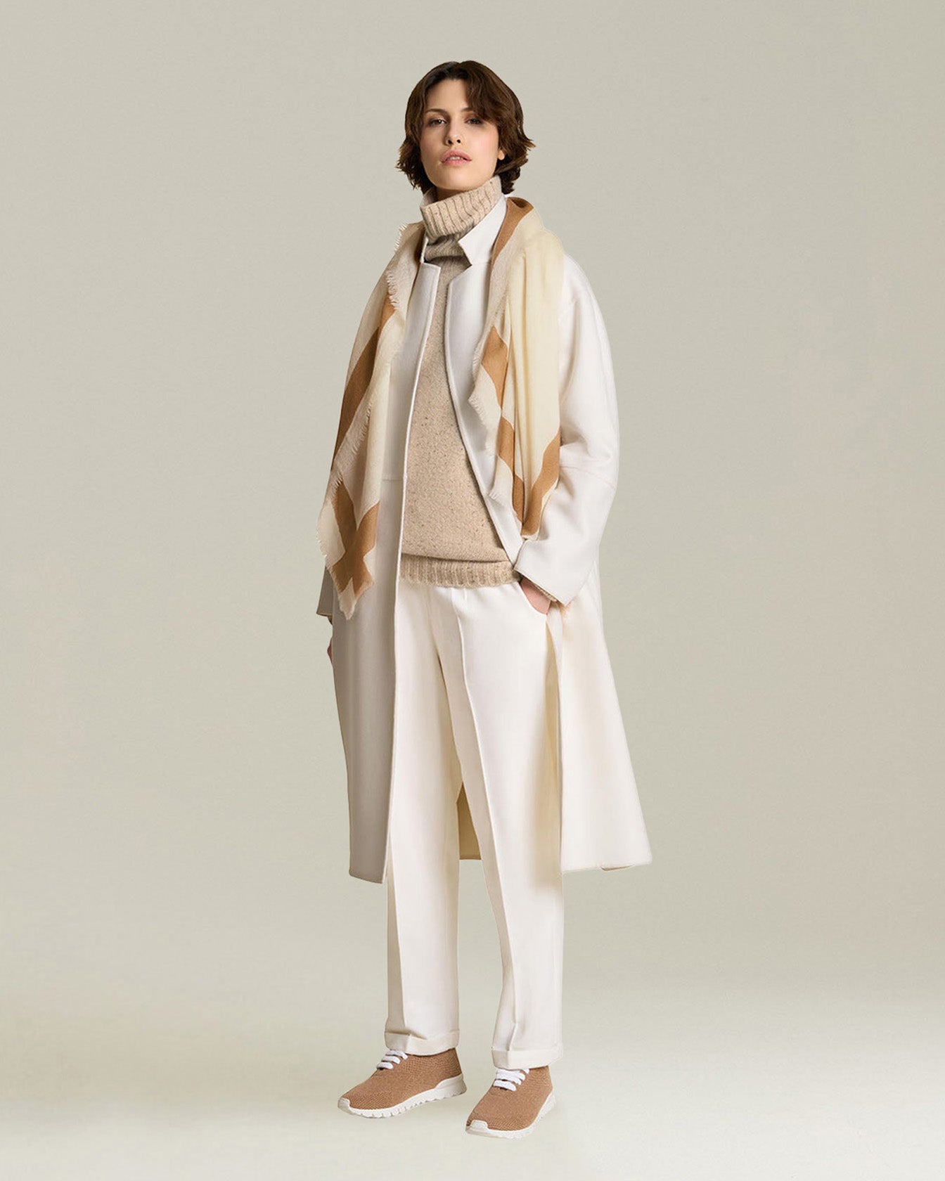 In Kiton, la qualità dei tessuti è un sapere profondamente radicato, frutto di un'eredità che si estende per sette generazioni. La filosofia di Kiton si fonda su principi essenziali: l'uso di fibre naturali, fondamentali per la creazione di abiti di altissima qualità, e lavorazioni artigianali che rispettano la delicatezza e la raffinatezza dei materiali. Il nostro lanificio di Biella è stato trasformato in un centro di incessante sperimentazione, dedicato alla ricerca di nuove fantasie, texture e combinazioni di materiali, con un'attenzione particolare alla sostenibilità e alla salvaguardia dell’ambiente.