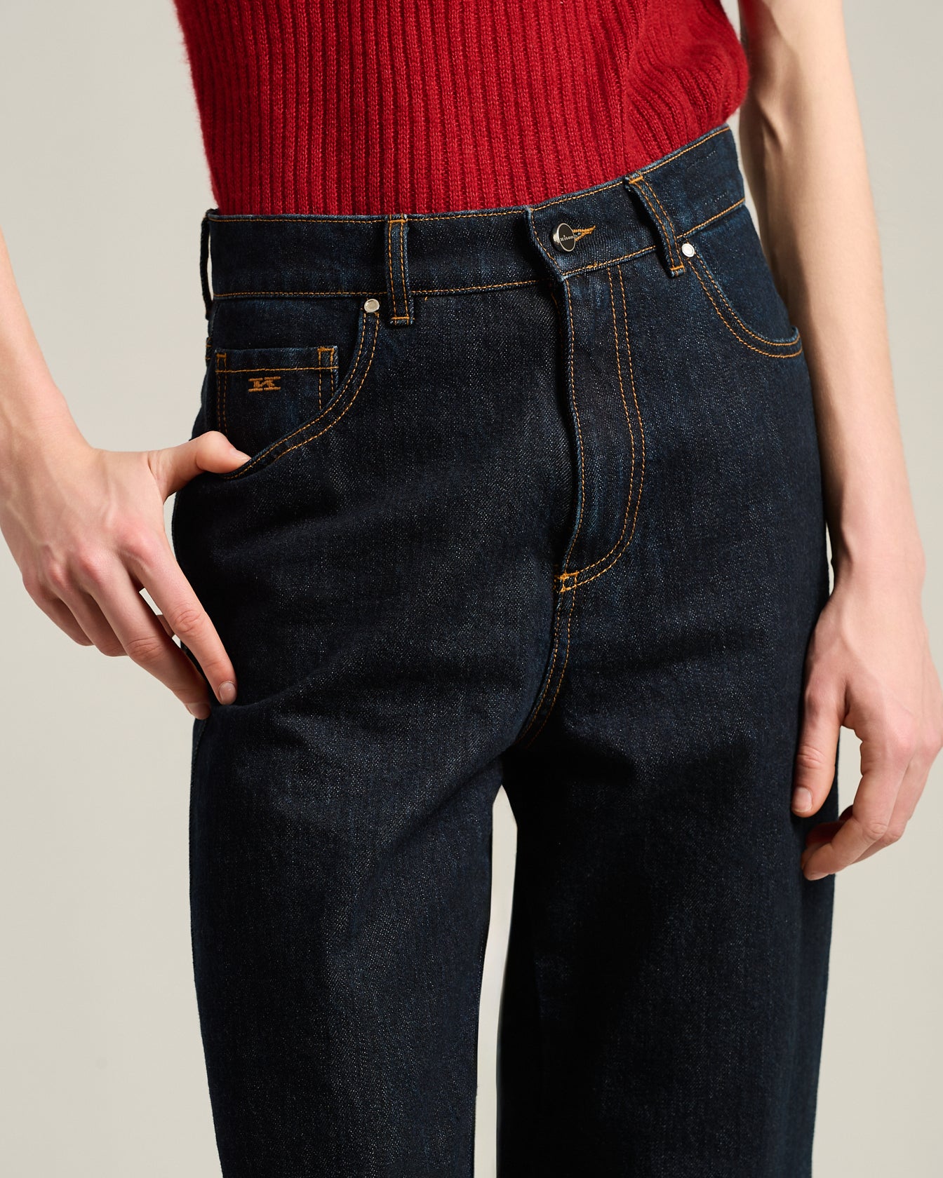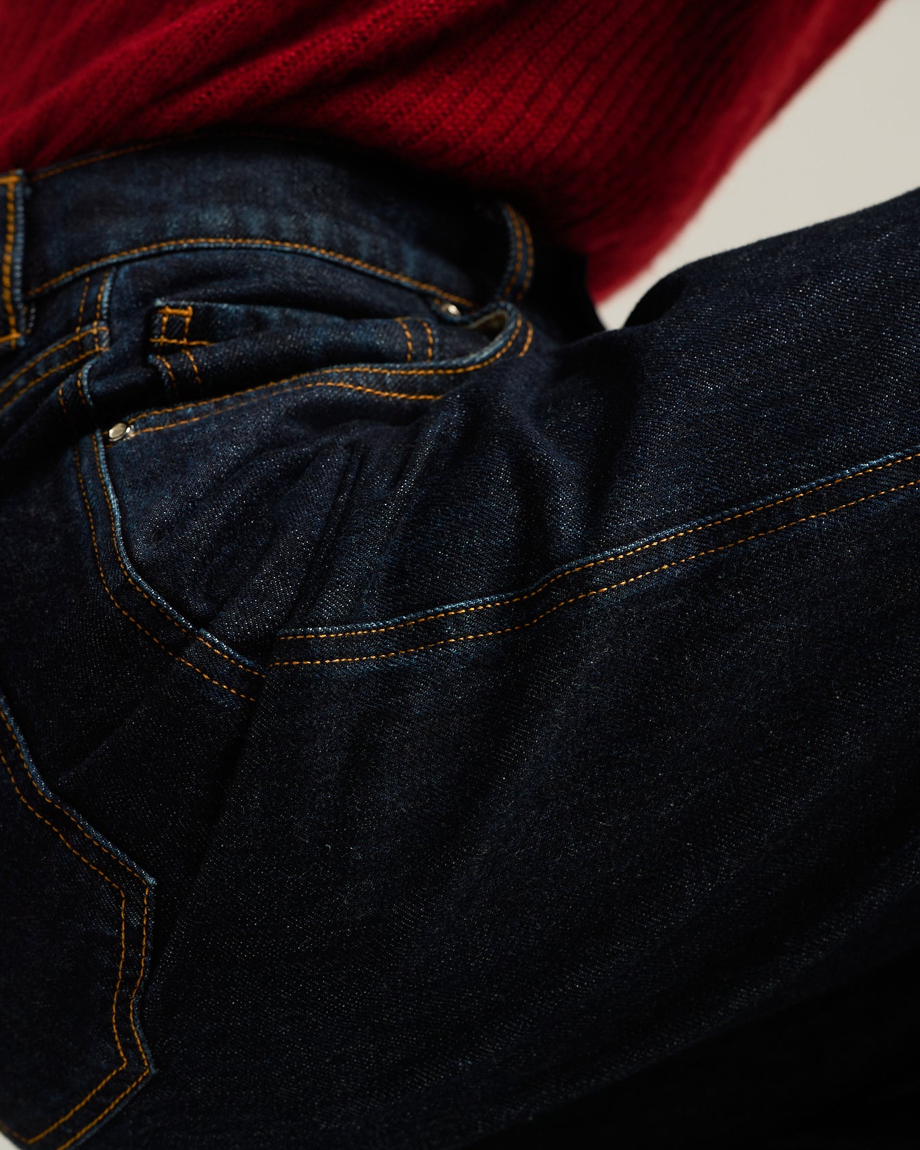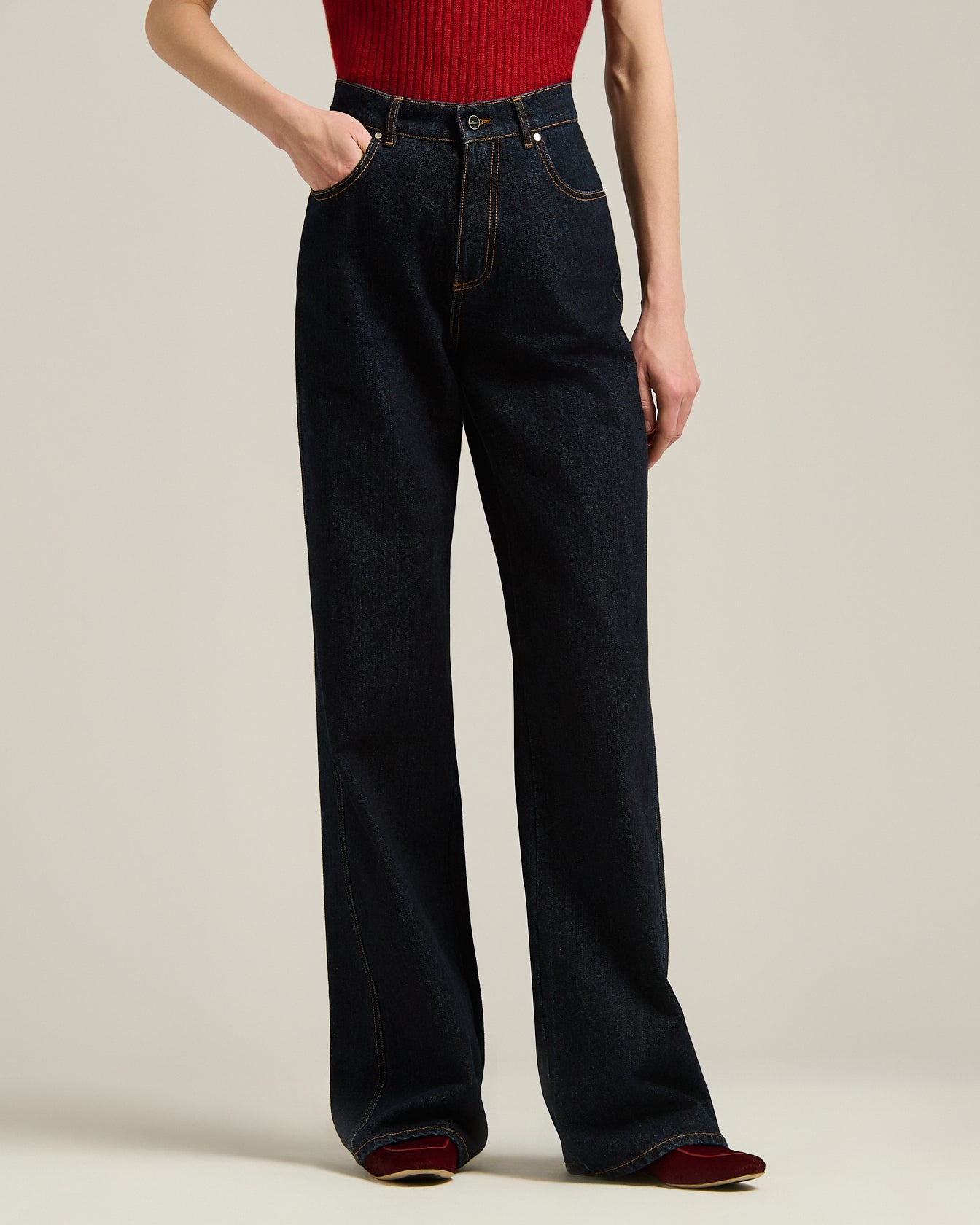 Un'eleganza decisa incontra l’anima del denim in questi pantaloni a palazzo a vita alta, realizzati in puro cotone. La tonalità molto scura del tessuto dona profondità e raffinatezza, valorizzando la linea ampia e fluida della gamba. Il taglio a vita alta slancia la figura e sottolinea la silhouette con sobrietà. Privi di elastan, mantengono la struttura autentica del denim, per un look dal carattere contemporaneo ma radicato nella tradizione sartoriale. Ideali da interpretare in chiave chic o casual, a seconda degli abbinamenti.