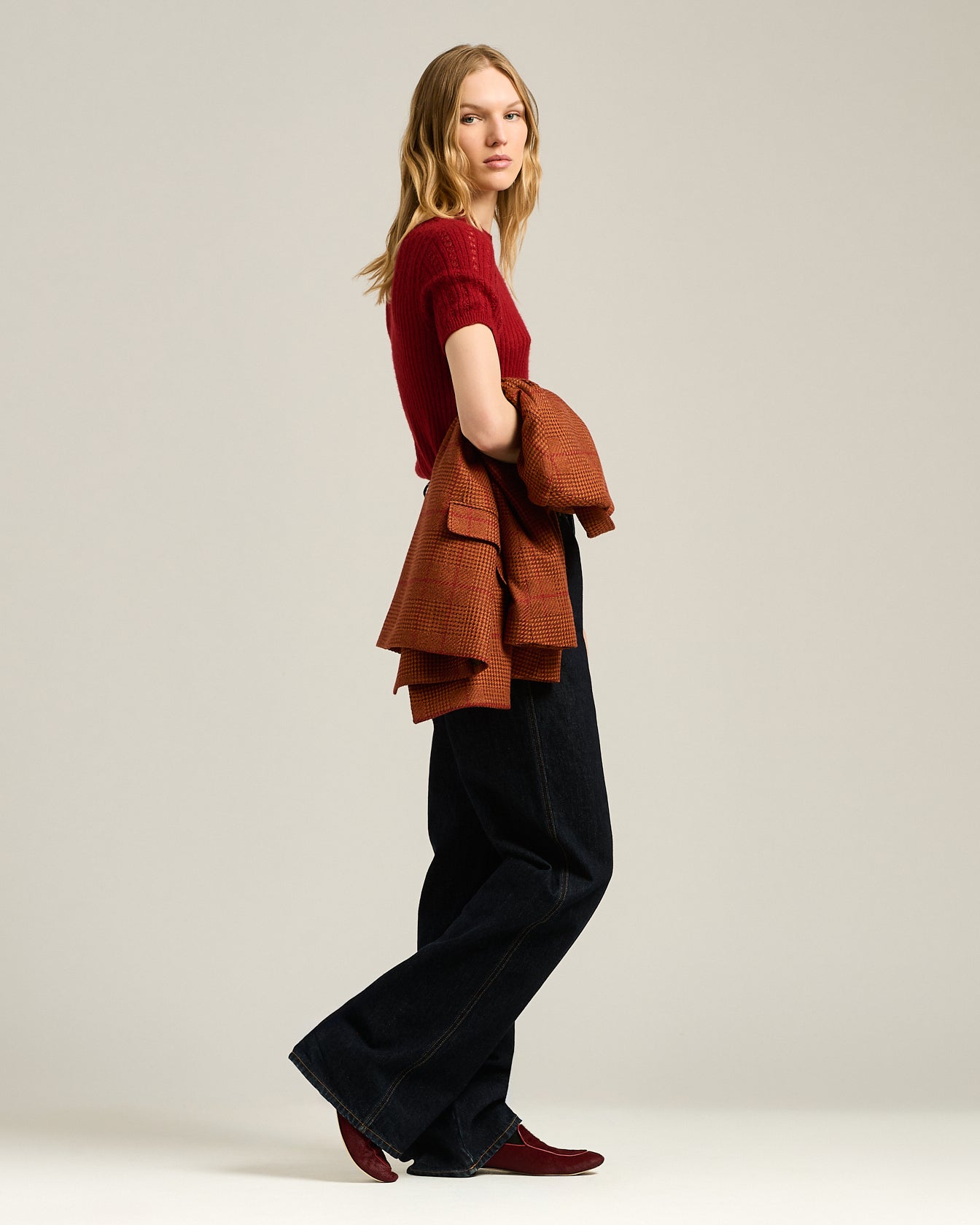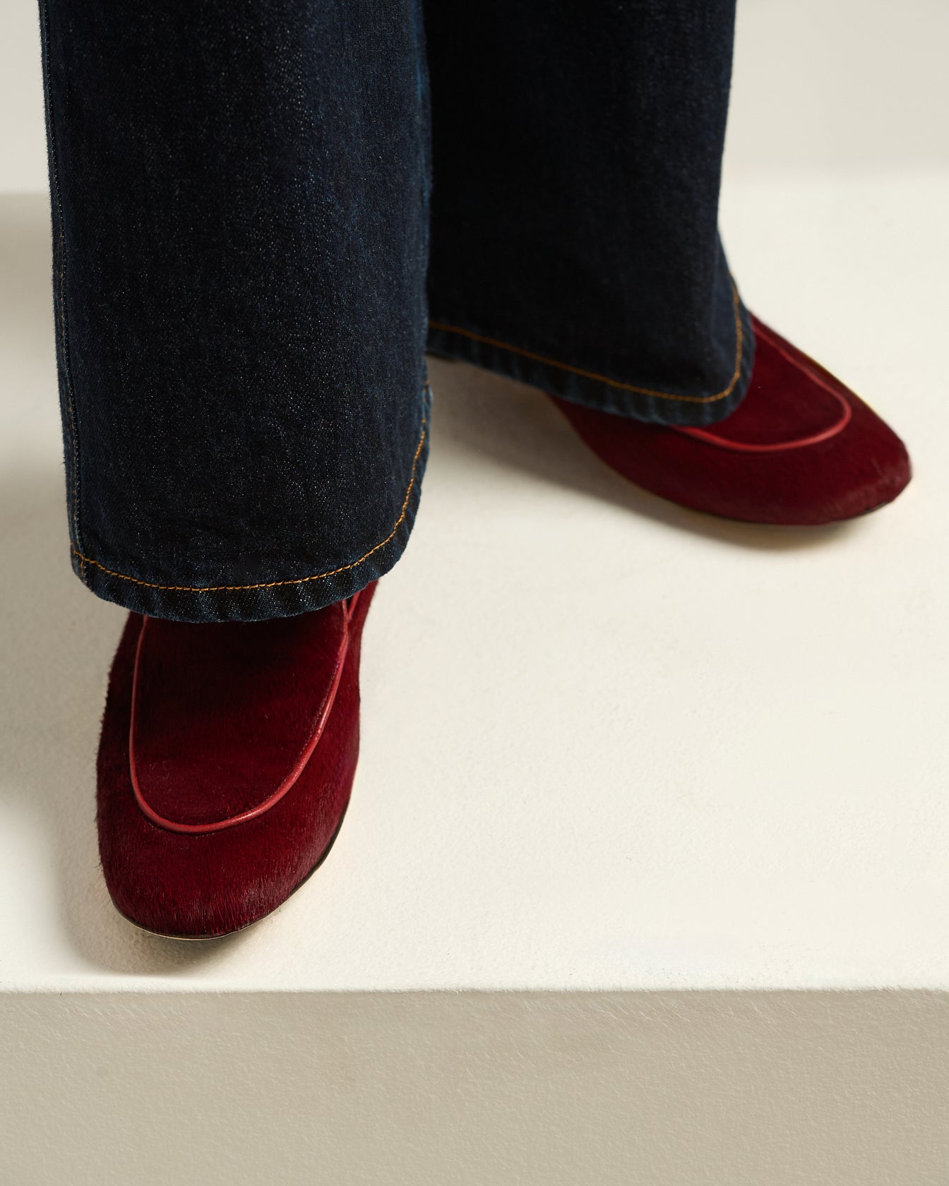 Un’eleganza decisa e contemporanea caratterizza questo mocassino Kiton, realizzato in raffinato calfhair color bordeaux, impreziosito da sottili rifiniture rosse che ne esaltano il design con un tocco di carattere. La texture vellutata del pellame a pelo corto dona profondità e personalità alla calzatura, mentre la costruzione artigianale riflette l’eccellenza manifatturiera del brand. La mascherina classica e la silhouette affusolata mantengono intatto il richiamo alla tradizione, reinterpretata però in chiave audace e sofisticata. Perfetto per chi desidera distinguersi con stile, senza rinunciare al comfort e alla qualità dei materiali.