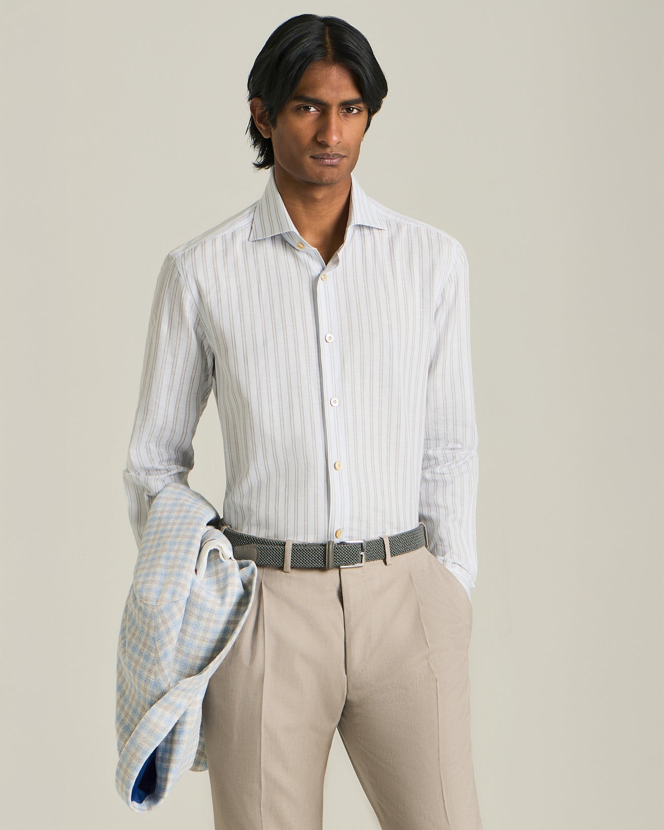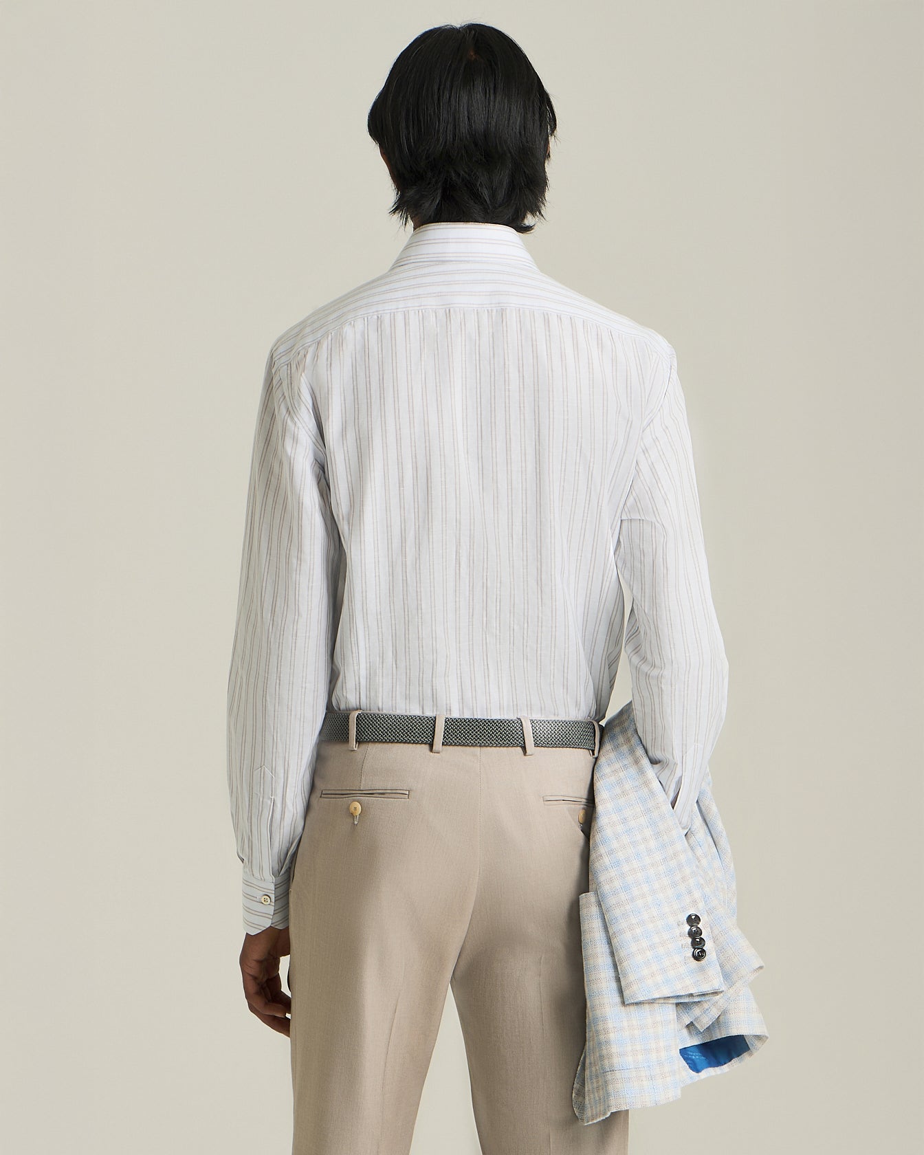 La camicia Kiton è un capo intimo che abbraccia con grazia il corpo di chi lo indossa, un caleidoscopio di stampe, geometrie e colori raffinati, dove ogni singolo taglio riporta in vita il disegno originale. I tessuti si intrecciano con maestria, creando una camicia che diventa un mosaico da indossare. Il fatto a mano, con la sua cura e minuzia, rende ogni pezzo unico, una storia a sé stante. La morbidezza dei materiali offre un piacere tattile ineguagliabile, avvolgendo le dita in una sensazione di lusso. Ogni dettaglio è un segno di pregio fino ai filati pregiati utilizzati: seta per le asole, mouliné per le iniziali, fibra per cucire i bottoni e un filato speciale, sottilissimo, per le ribattiture. Il risultato è un capo elegante e confortevole, che trasmette immediatamente l’esperienza e la cura artigianale.