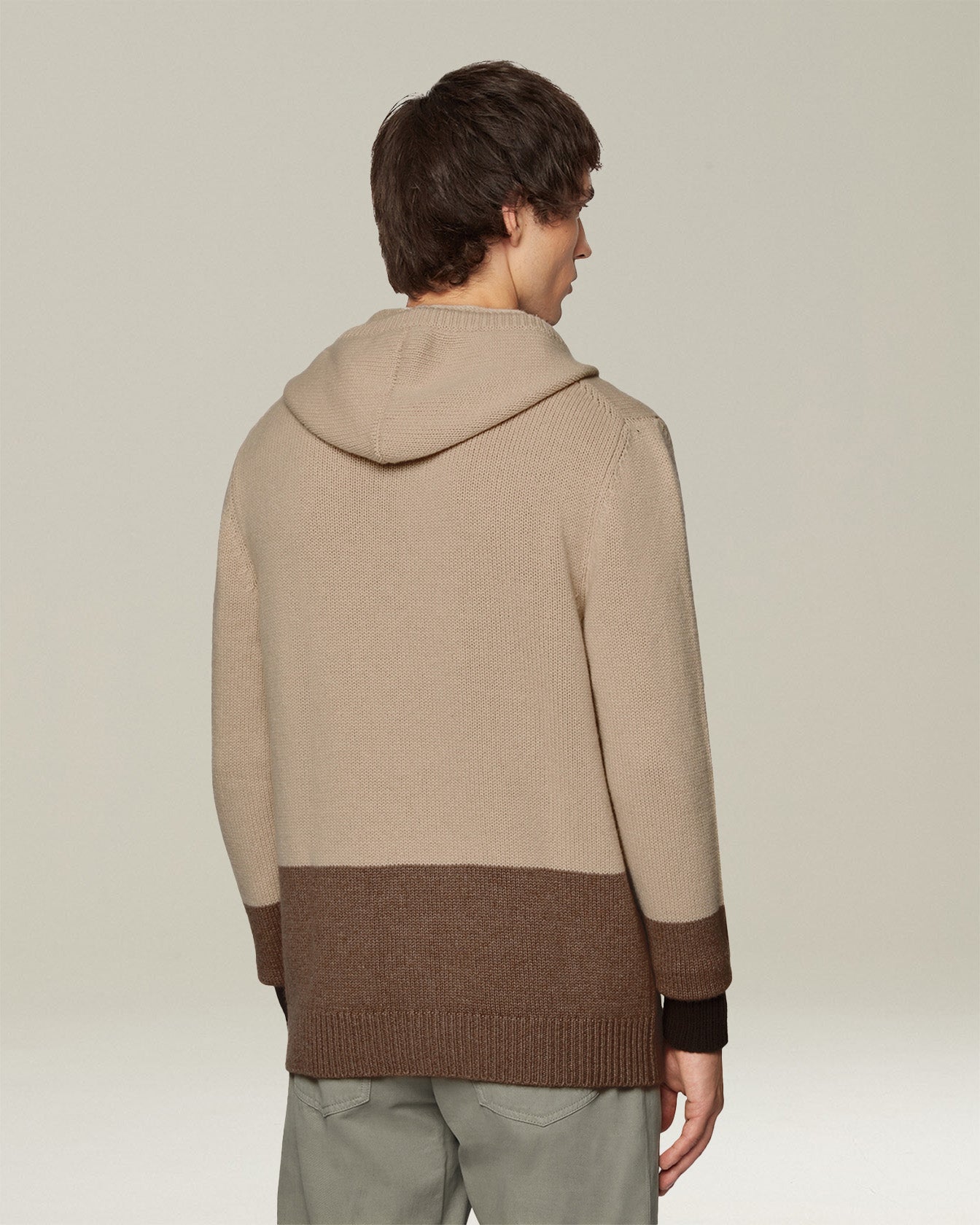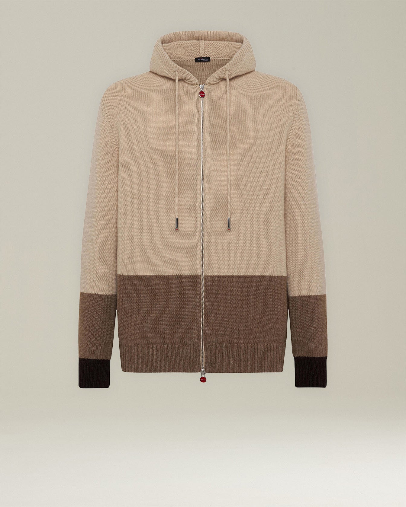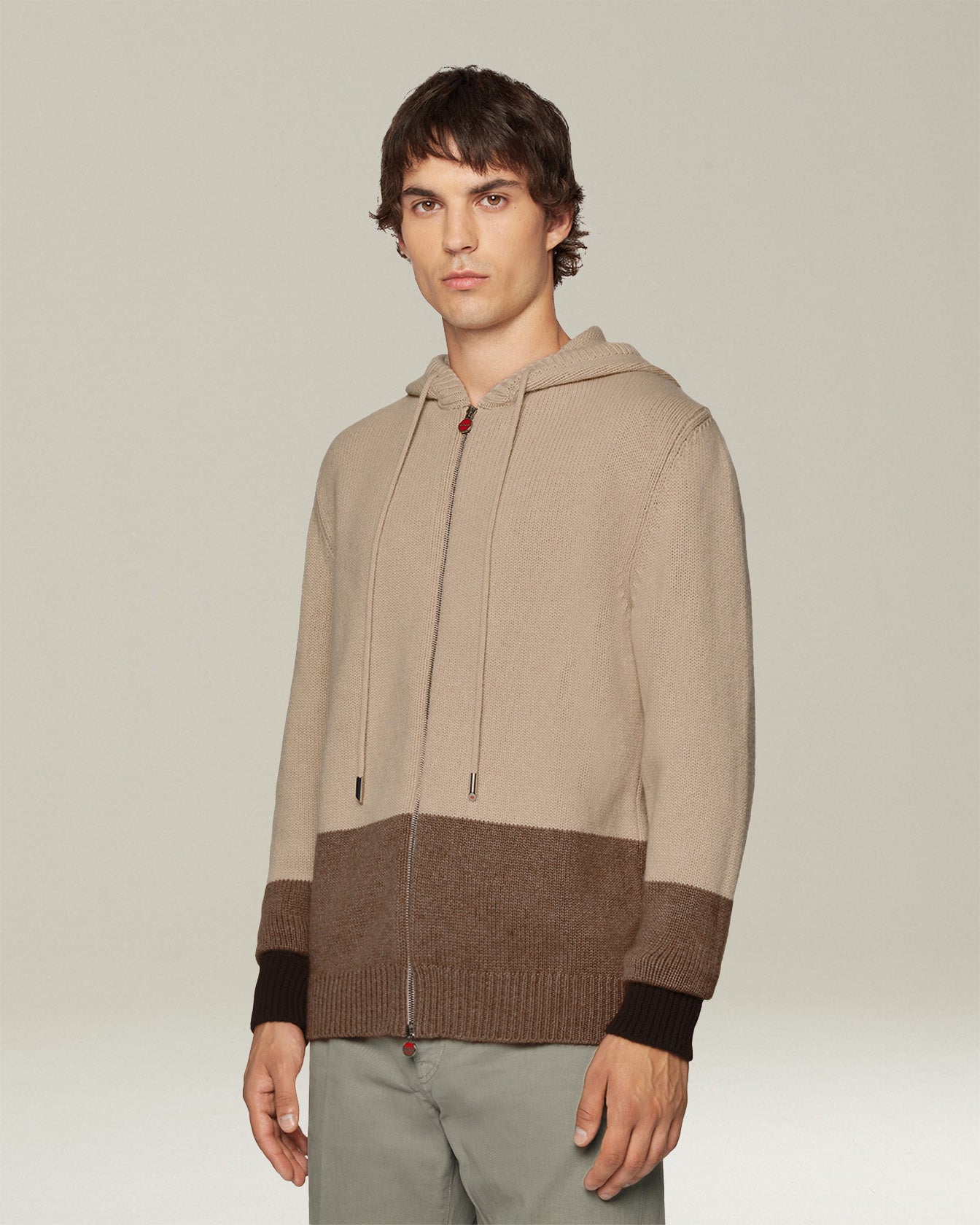 Kiton knitwear is the embodiment of loyalty to tradition and a constant quest for excellence. This colour block hooded bomber jacket in a soft, comfortable cashmere yarn reflects a relaxed attitude, ideal for leisure, combined with a clean, minimal chic construction. The profiles, embellished with sophisticated ribbed work, emphasise its sophistication.