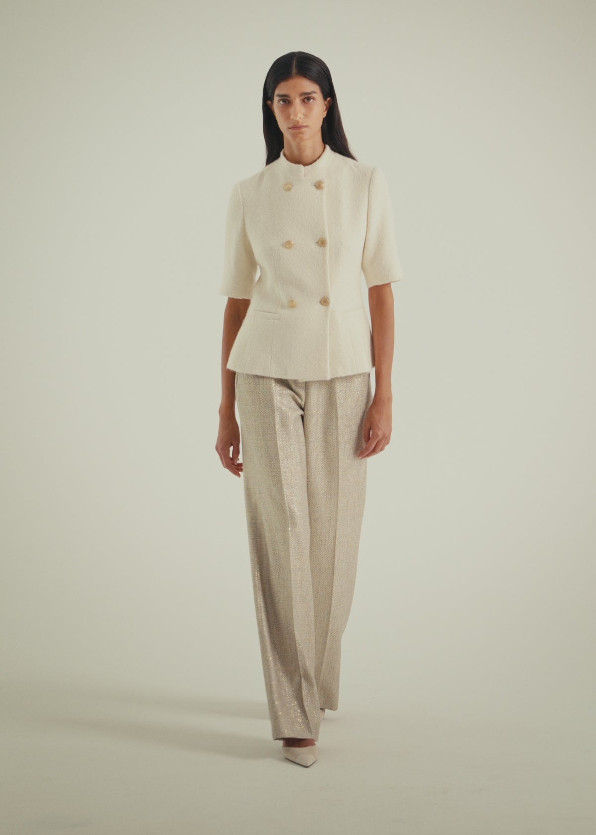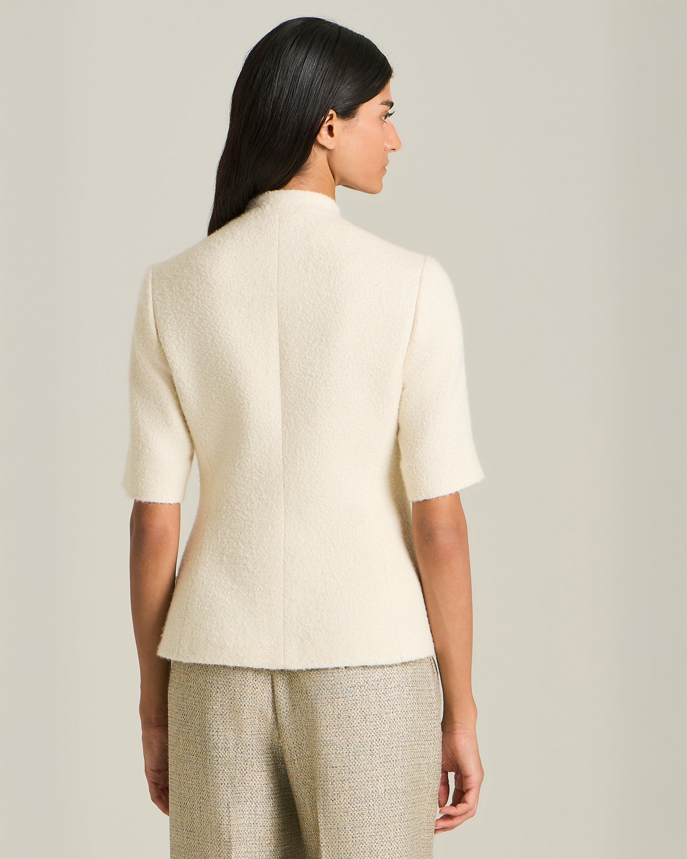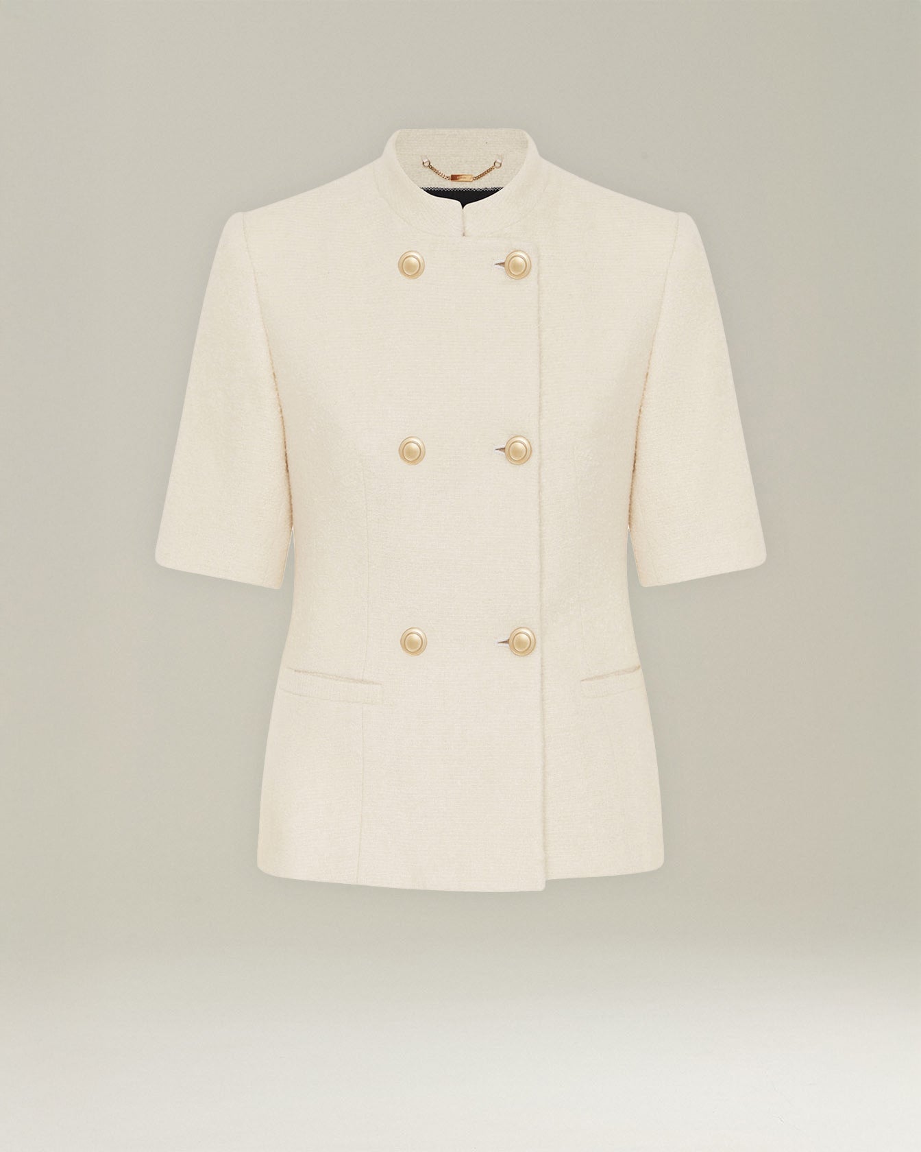 Crafted from a fine cashmere-silk blend with a soft, slightly fluffy texture, this double-breasted jacket has a luxurious wrap-around feel and a structured cut with short sleeves - ideal for milder days. Contrasting gold buttons add a touch of light and class, while the mandarin collar lends an aura of exclusivity. A coveted garment that is perfect for dressing up your ensemble for formal occasions, while always maintaining an allure of discreet luxury.