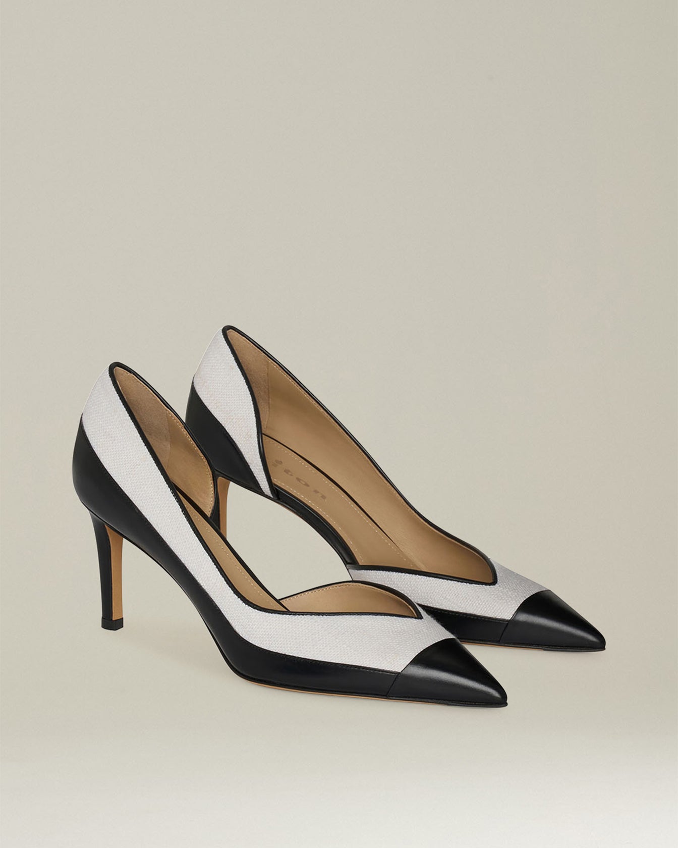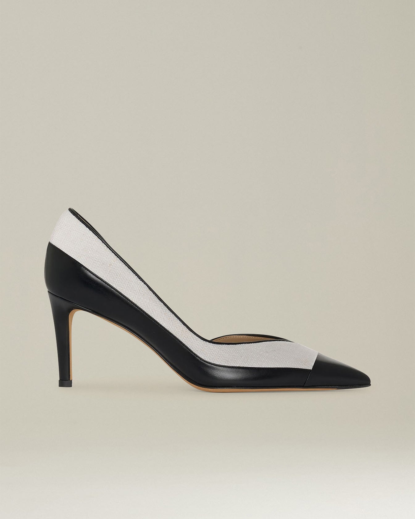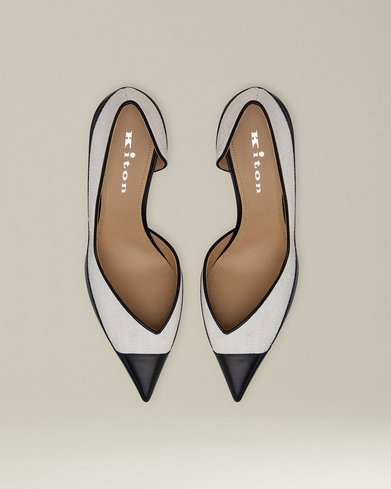 This women’s court shoe from Kiton is the perfect blend of elegance and modernity, crafted from soft, high-quality lambskin and embellished with a sophisticated contrasting cotton canvas insert. The combination of materials gives the shoe a unique appeal, alternating the smooth, velvety texture of leather with the more structured texture of cotton for a striking visual and tactile effect. The side opening adds a touch of contemporary style, accentuating the line of the foot with a twist. Sitting on a 7cm heel, this court shoe offers the perfect balance between height and comfort, easily adapting to different occasions from day to evening. The sleek, streamlined silhouette makes it ideal for completing both formal looks and casual-chic outfits.