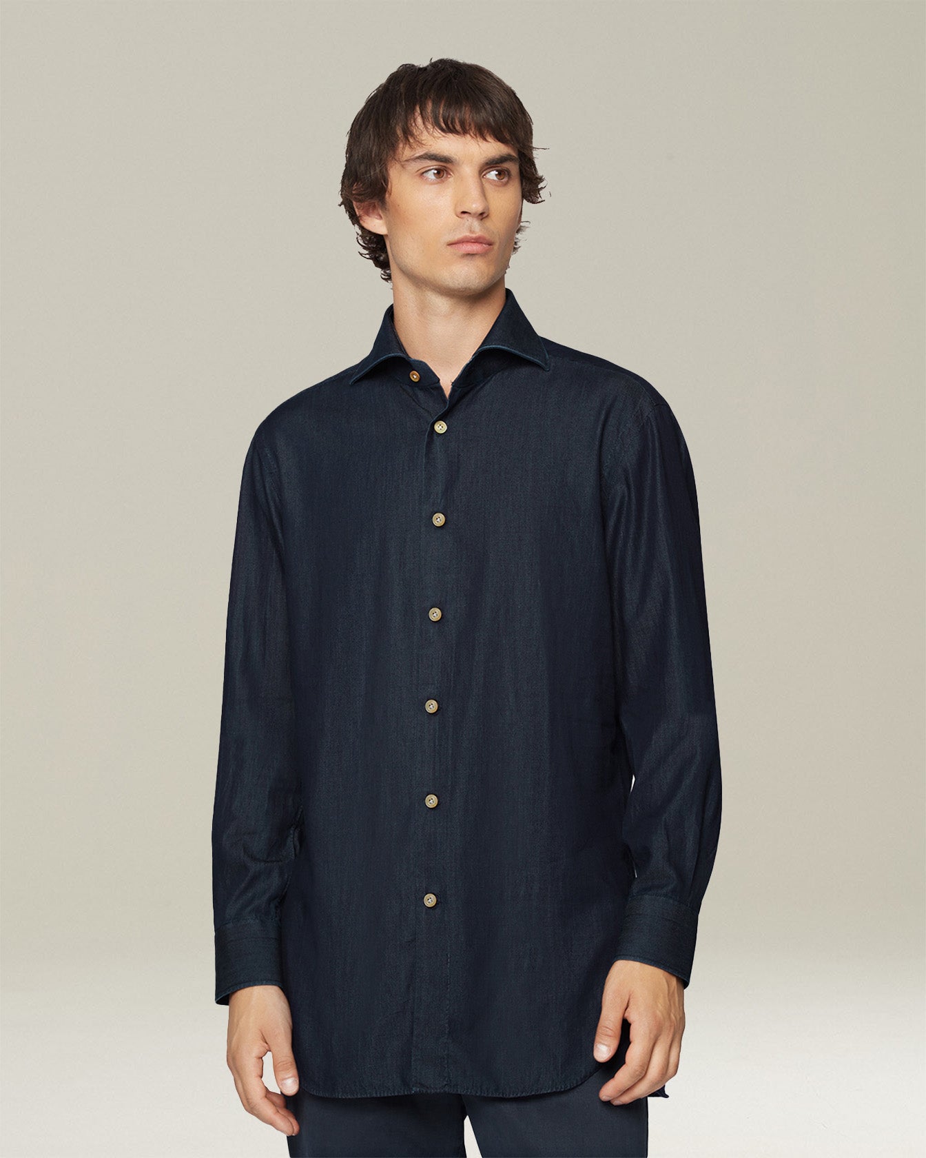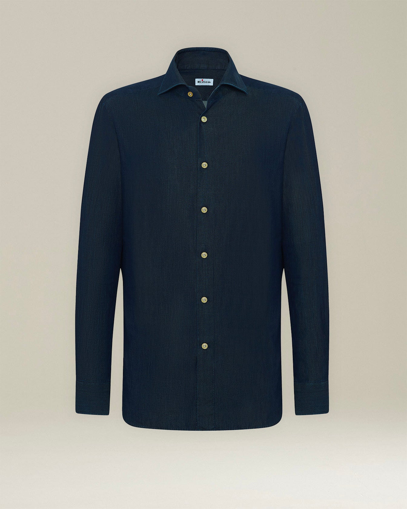 Combining the sporty style of denim with the sophisticated simplicity of this Kiton shirt, the result is a garment that elegantly hugs the body, follows every movement and enhances the silhouette. Meticulously handcrafted in 22 steps in our Naples atelier, this shirt represents the ultimate expression of sartorial craftsmanship: each cut of fabric conceals soft, hand-worked seams that guarantee an impeccable fit. Ideal both for formal and professional contexts, when worn with a suit, and for moments of relaxation, paired with a casual look, this shirt is embellished with hand-carved buttons made from Sydney Pinctada Maxima mother of pearl from the crystal-clear waters of the Australian seas.