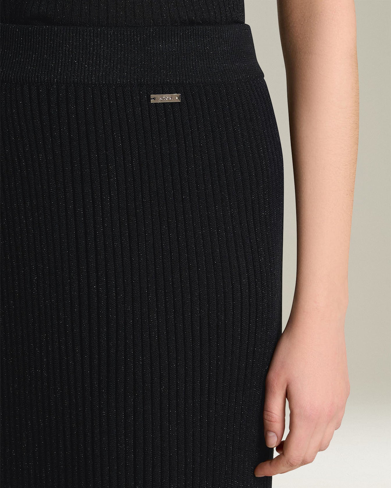 Kiton knitwear is renowned for its fierce dedication to tradition and a constant quest for excellence. This skirt is made from a wool blend that combines traditional rib knitting with a lamé yarn, creating metallic highlights along the surface of the garment. The sheath-like silhouette, together with the comfortable, snug fit, gives it a modern, timeless allure.