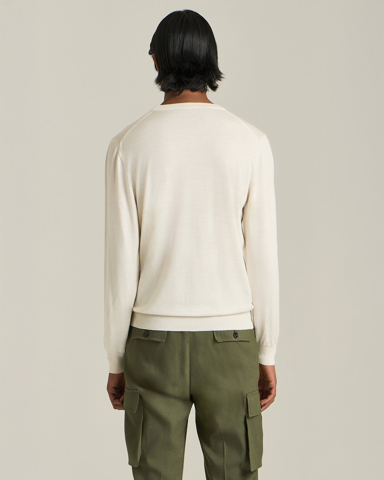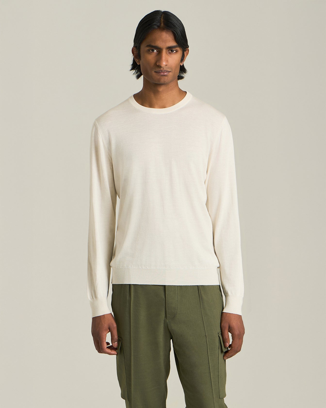 Crafted from a fine blend of silk, cashmere and linen, Kiton’s crew neck sweater is the essence of minimal chic. The light, soft texture of the yarn, produced exclusively in our wool mill, gives the garment an extremely sophisticated feel, enveloping the body in a gentle, comfortable embrace. Breathable and lightweight, yet warm and snug, this jersey is perfect for mid-seasons.