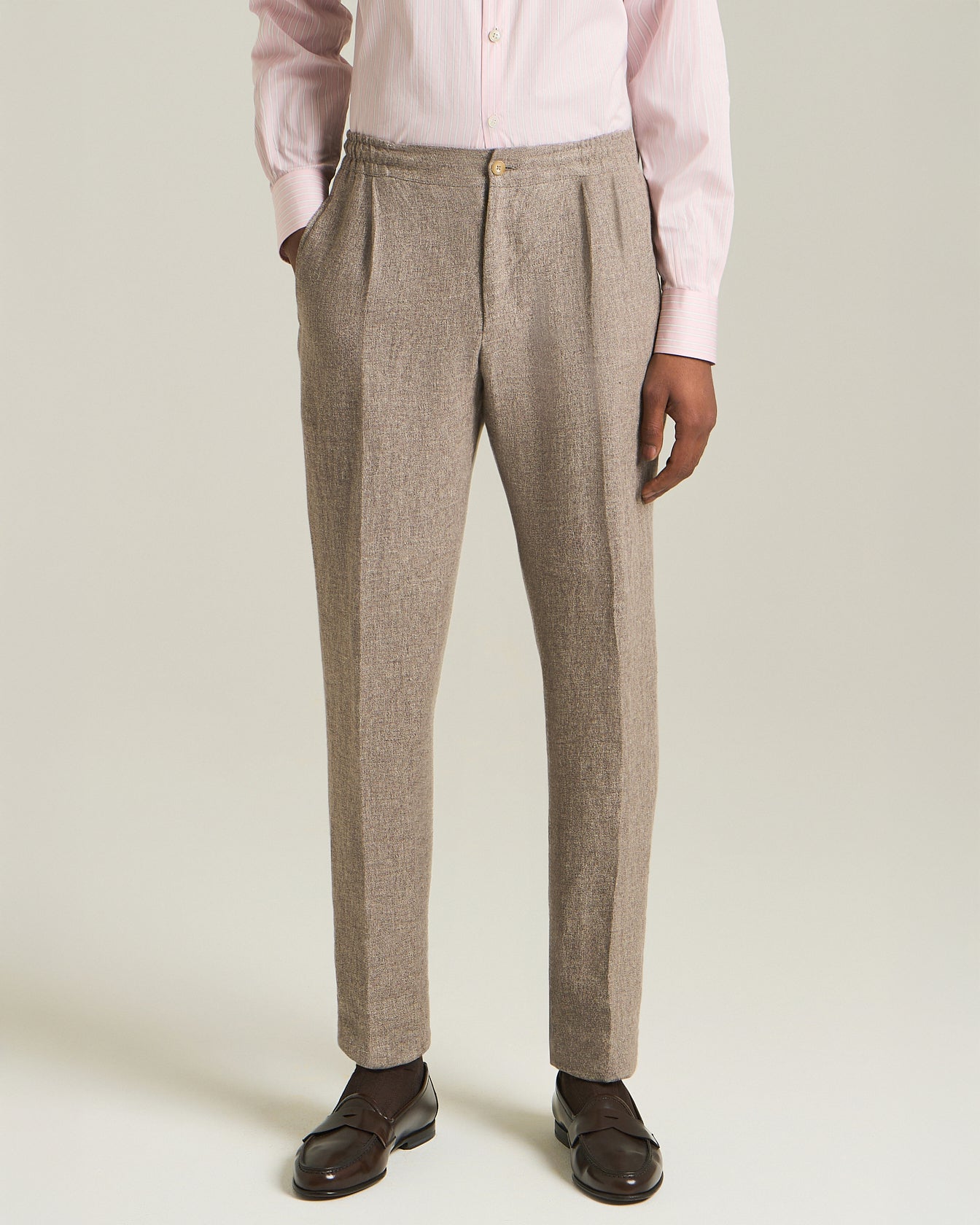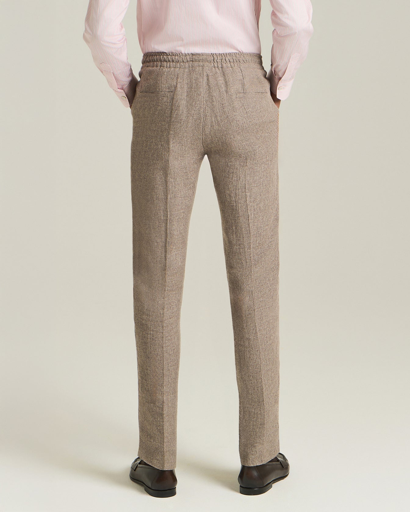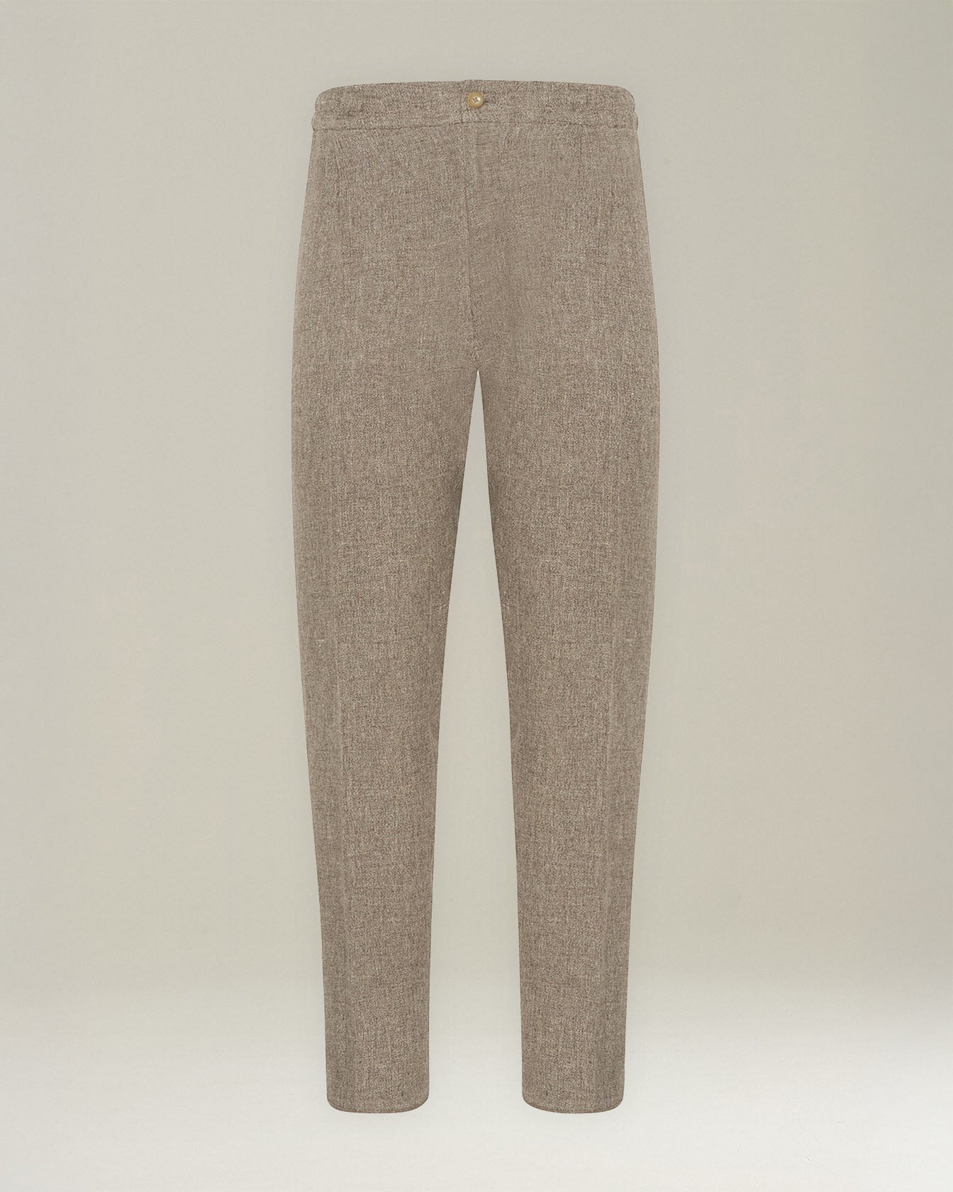 These Kiton trousers reinterpret the concept of casual with a wider, more relaxed silhouette. Crafted from a fine linen yarn, these trousers are characterised by sophisticated details such as welt pockets and French darts. The sporty drawstring waist blends with the tailored precision of the darts to create the perfect balance of elegance and comfort. Designed for those who want to tackle any occasion, from travel to everyday life, with style and practicality, these trousers represent the essence of Kiton’s relaxed elegance.